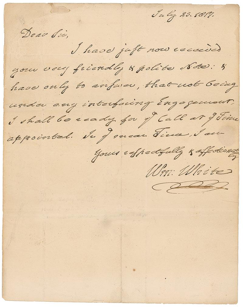 First and fourth Presiding Bishop of the Episcopal Church (1748-1836). ALS signed “Wm: White,” one page, 8 x 10, July 23, 1817. White prepares to entertain. In part: “I have just now received your very friendly & polite note…not being under any interfering engagement, I shall be ready for your call.” Second integral page bears an address panel in White’s hand. In very good condition, with intersecting folds, separation along hinge, scattered wrinkling and creasing, and a few small edge tears. RRAuction COA.