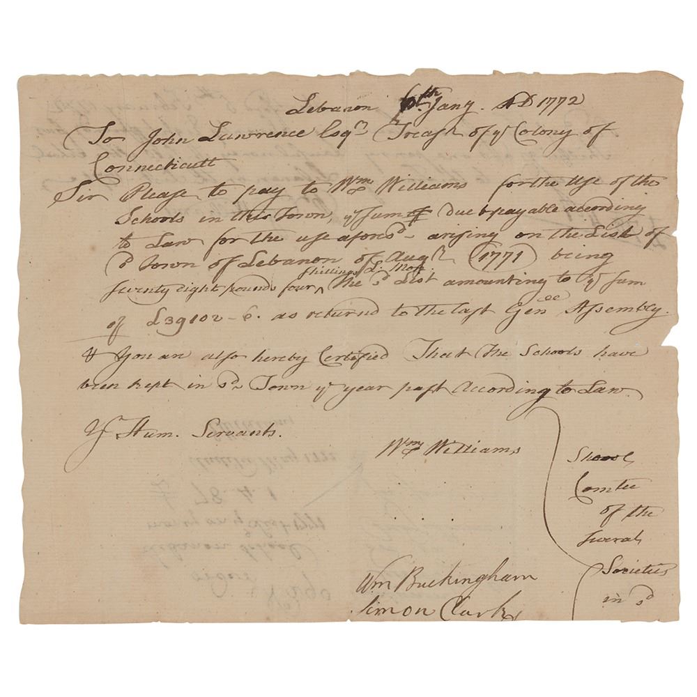 Third-person ADS, signed within the text and at the conclusion, ‰ÛÏWm. Williams,‰Û one page, 7.5 x 6.5, January 6, 1772. Handwritten pay order issued to Treasurer John Lawrence, in part: "Please to pay to Wm. Williams for the use of the Schools in this Town‰Û_due & payable according to Law for the use afores'd, arising on the List of s'd Town of Lebanon‰Û_being seventy eight pounds four shillings." Signed at the conclusion by Williams and two other members of the school committee. In fine condition, with splits to ends of folds