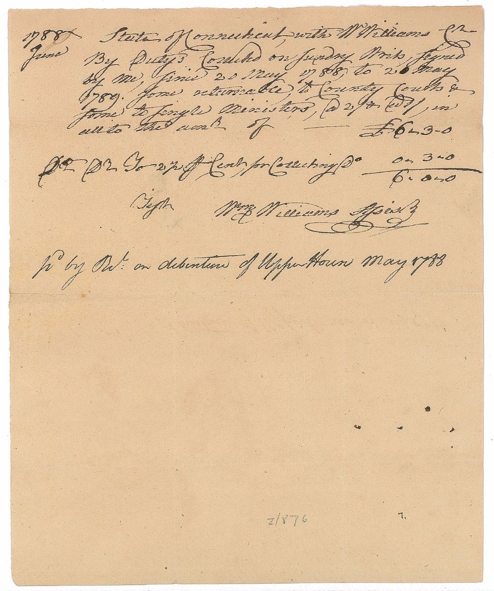 ADS, signed within the the body, “W. Williams,” and at the conclusion, “Wm. Williams,” one page, 6.25 x 7.75, June 1788. In part: “State of Connecticut, with W. Williams…By Dutys…on Sundry Writs, signed by me…some returnable to County Courts & some to…Ministers…in all to the acct of £6.3.0.” In fine condition.