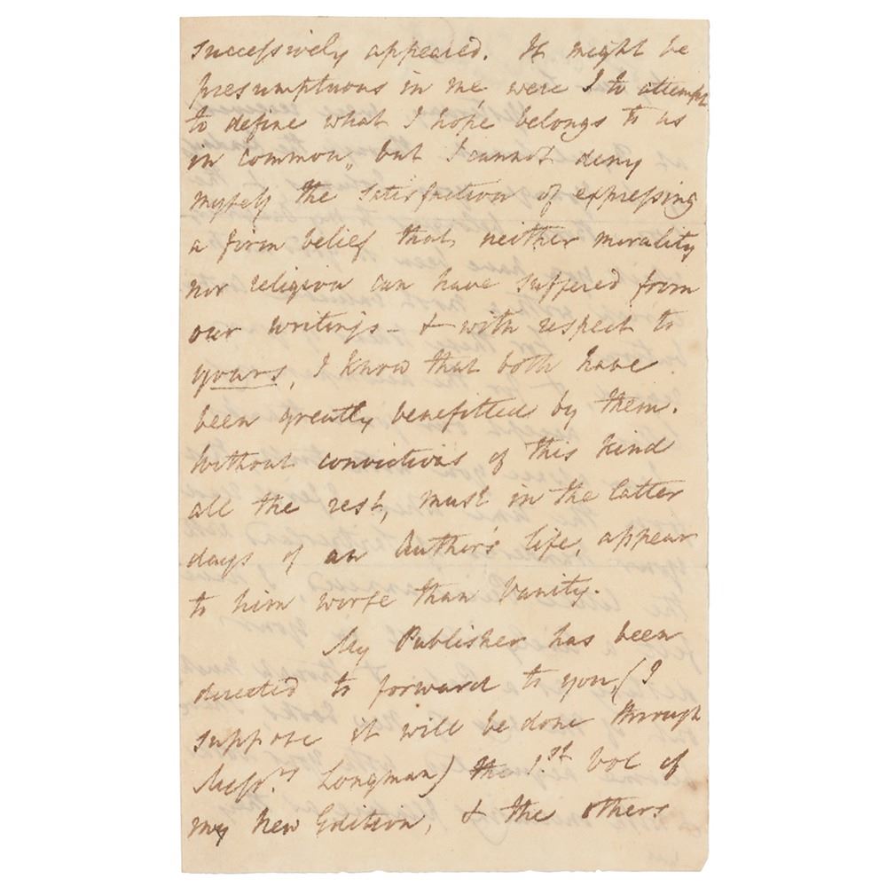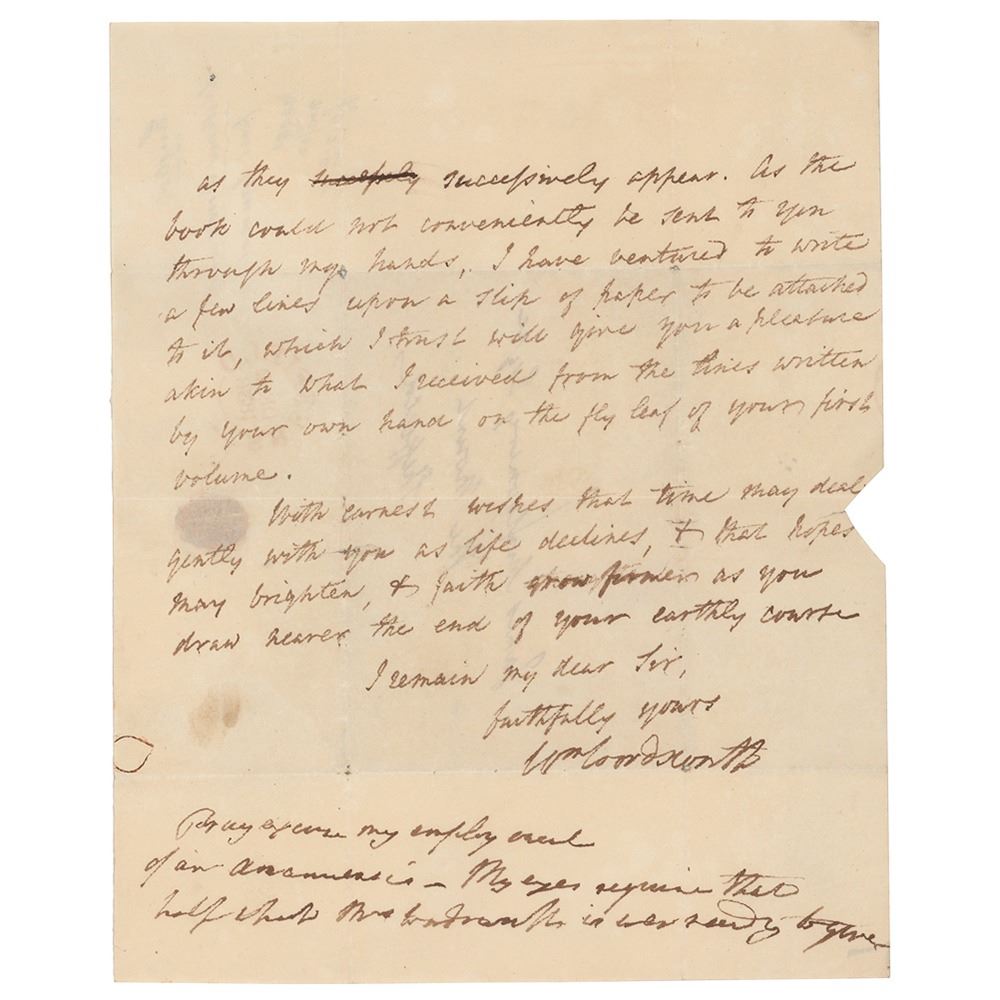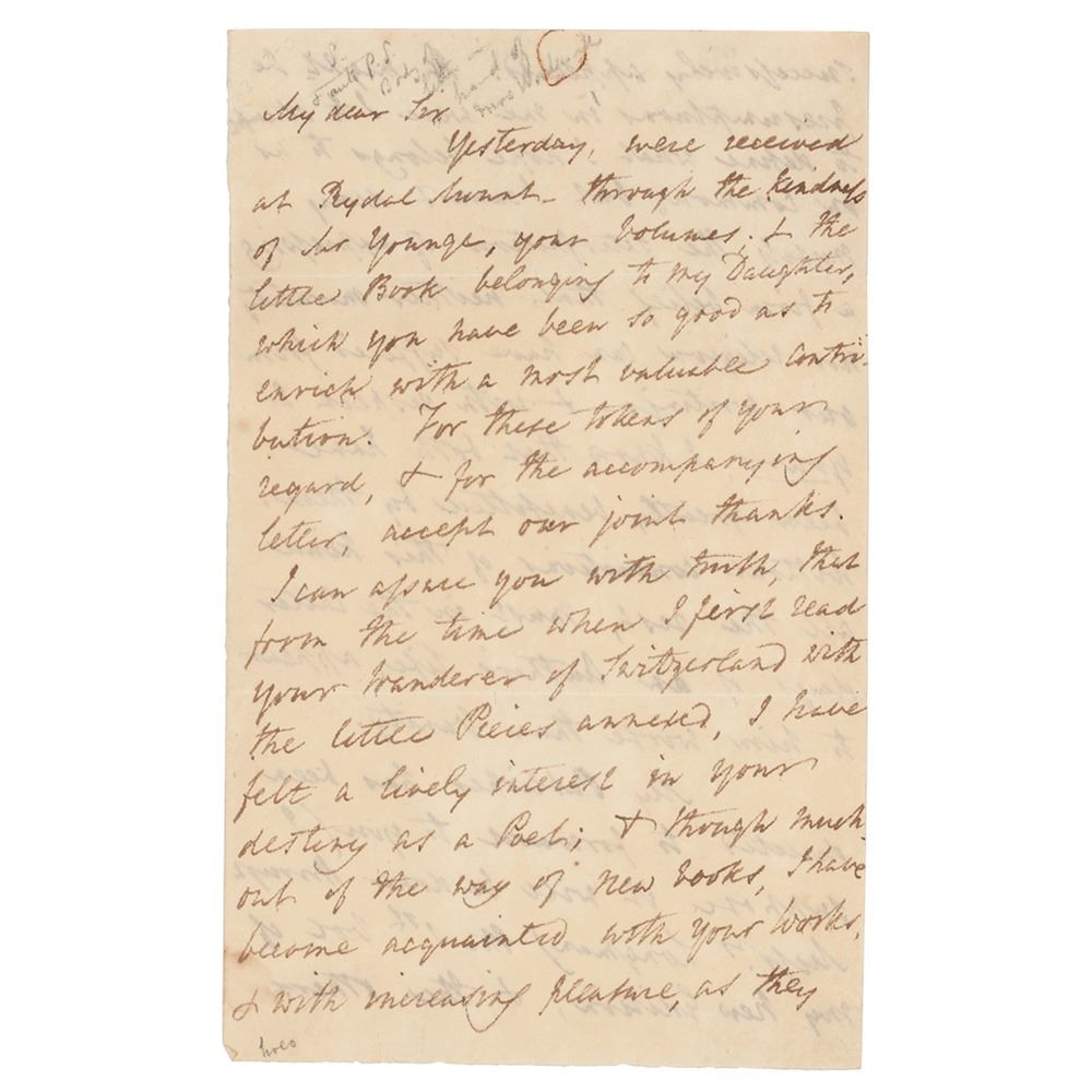 ALS signed “Wm. Wordsworth,†three pages, 4.5 x 7.5, no date. Handwritten letter to Scottish-born hymn writer and poet James Montgomery, acknowledging receipt of "your Volumes & the little Book belonging to my Daughter, which you have been so good as to enrich with a most valuable contribution." He continues, in part: "For these tokens of your regard, & for the accompanying letter, accept our joint thanks. I can assure you with truth, that from the time when I first read your Wanderer of Switzerland with the little Pieces annexed, I have felt a lively interest in your destiny as a Poet; & though much out of the way of new books, I have become acquainted with your works…I cannot deny myself the satisfaction of expressing a firm belief that neither morality nor religion can have suffered from our writings—& with respect to yours, I know that both have been greatly benefitted by them…My Publisher has been directed to forward to you…the 1st Vol. of my New Edition, & the others as they successfully appear. As the book could not conveniently be sent to you through my hands, I have ventured to write a few lines upon this slip of paper to be attached to it, which I trust will give you a pleasure akin to what I received from the lines written by your own hand on the fly leaf of your first volume." In fine condition, with a couple of small rusty paperclip impressions.