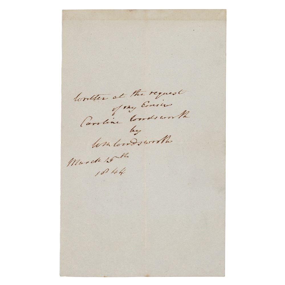 Ink signature, "Written at the request of thy cousin, Caroline Wordsworth, by Wm Wordsworth, March 15th, 1844,†on an off-white 4.5 x 7.25 sheet. In fine condition.
