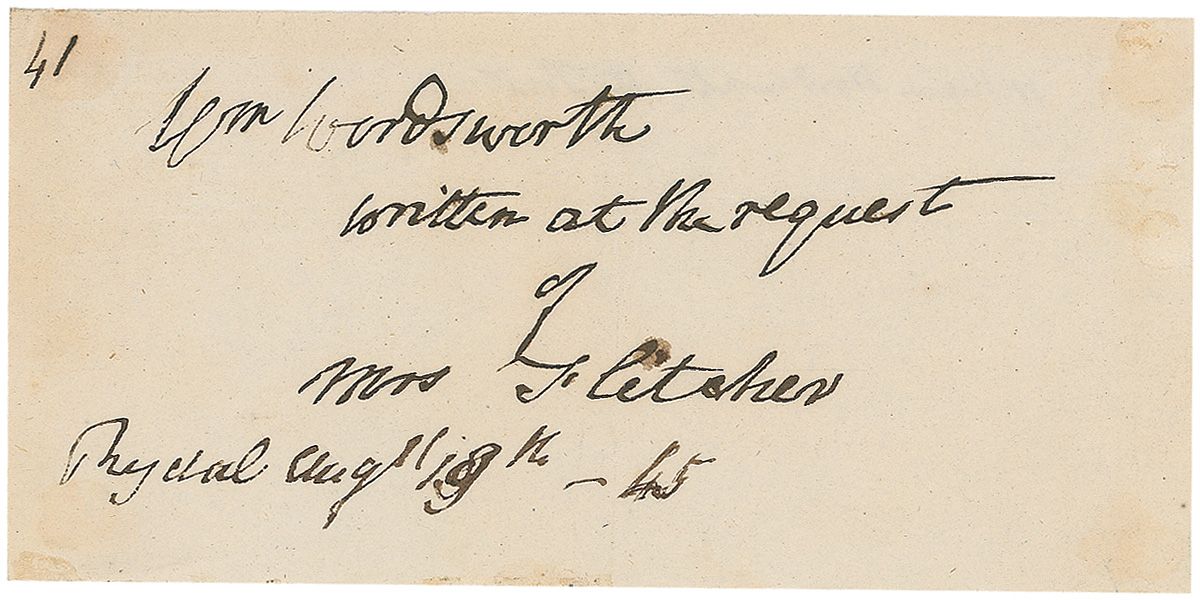 English poet and author (1770–1850) of ‘Lyrical Ballads,’ a collection inspired by the beauty of the English Lake District. Ink signature and inscription, “Wm. Wordsworth written at the request of Mrs. Fletcher, Rydal Augt 13th—45,” on an off-white 5.5 x 2.5 slip. A central vertical fold passing through a single letter of signature, a couple horizontal creases, some light toning to corners from mounting remnants on reverse, and a couple light ink spots to signature and inscription, otherwise fine condition.