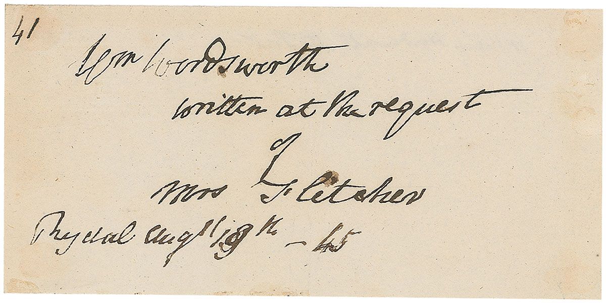 English poet and author (1770–1850) of ‘Lyrical Ballads,’ a collection inspired by the beauty of the English Lake District. Ink signature and inscription, “Wm. Wordsworth written at the request of Mrs. Fletcher, Rydal Augt 13th—45,” on an off-white 5.5 x