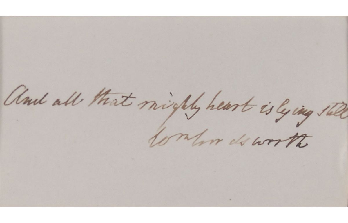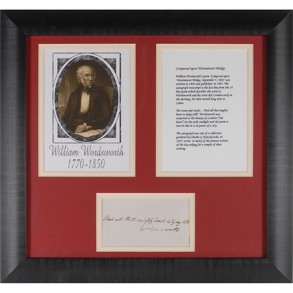 English poet and author (1770–1850) of ‘Lyrical Ballads,’ a collection inspired by the beauty of the English Lake District. Bold AQS on an off-white 5 x 2.75 sheet. Wordsworth pens the closing line of his poem ‘Composed upon Westminster Bridge, September 3, 1802,’ in full: “And all that mighty heart is lying still.” Signed at the conclusion in black ink, “Wm. Wordsworth.” Attractively double-matted and framed with an image of the poet and a typescript describing the poem’s historical background to an overall size of 16.5 x 15. In fine condition. Originates from the collection of Charles G. Kincaid, who acquired a number of autographs from prominent authors in 1845. The poem, written in 1802 but not published until 1807, describes the beauty of the city of London and the River Thames as viewed from Westminster Bridge in the early morning—a departure from the usual literary descriptions of 19th century cities, which focus on the resultant squalor of overpopulation. An exceptionally desirable quote from Wordsworth’s often anthologized poem.