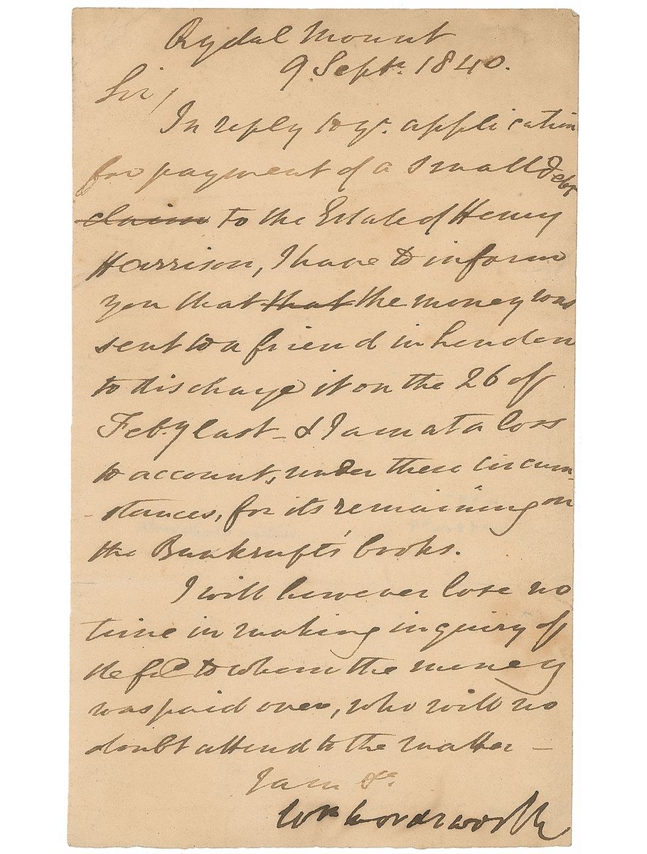 LS signed “Wm Wordsworth,” one page, 4.5 x 7.5, September 9, 1840. Letter to a gentleman. In part: “In reply to yr application for payment of a small debt to the estate of Henry Harrison…the money was sent to a friend in London to discharge it on the 26 of Feby last—& I am at a loss to account, under these circumstances, for its remaining on the Bankrupt's books. I will however lose no time in making inquiry of the fr[ien]d to whom the money was paid over, who will no doubt attend to the matter.” In fine condition, with light toning.