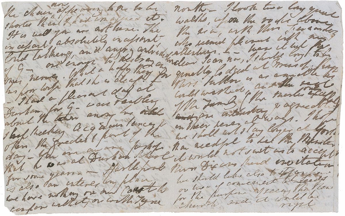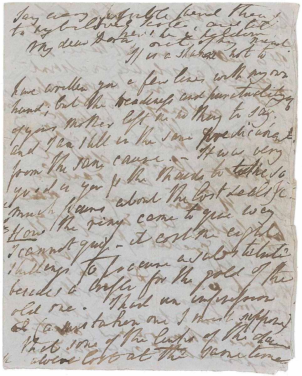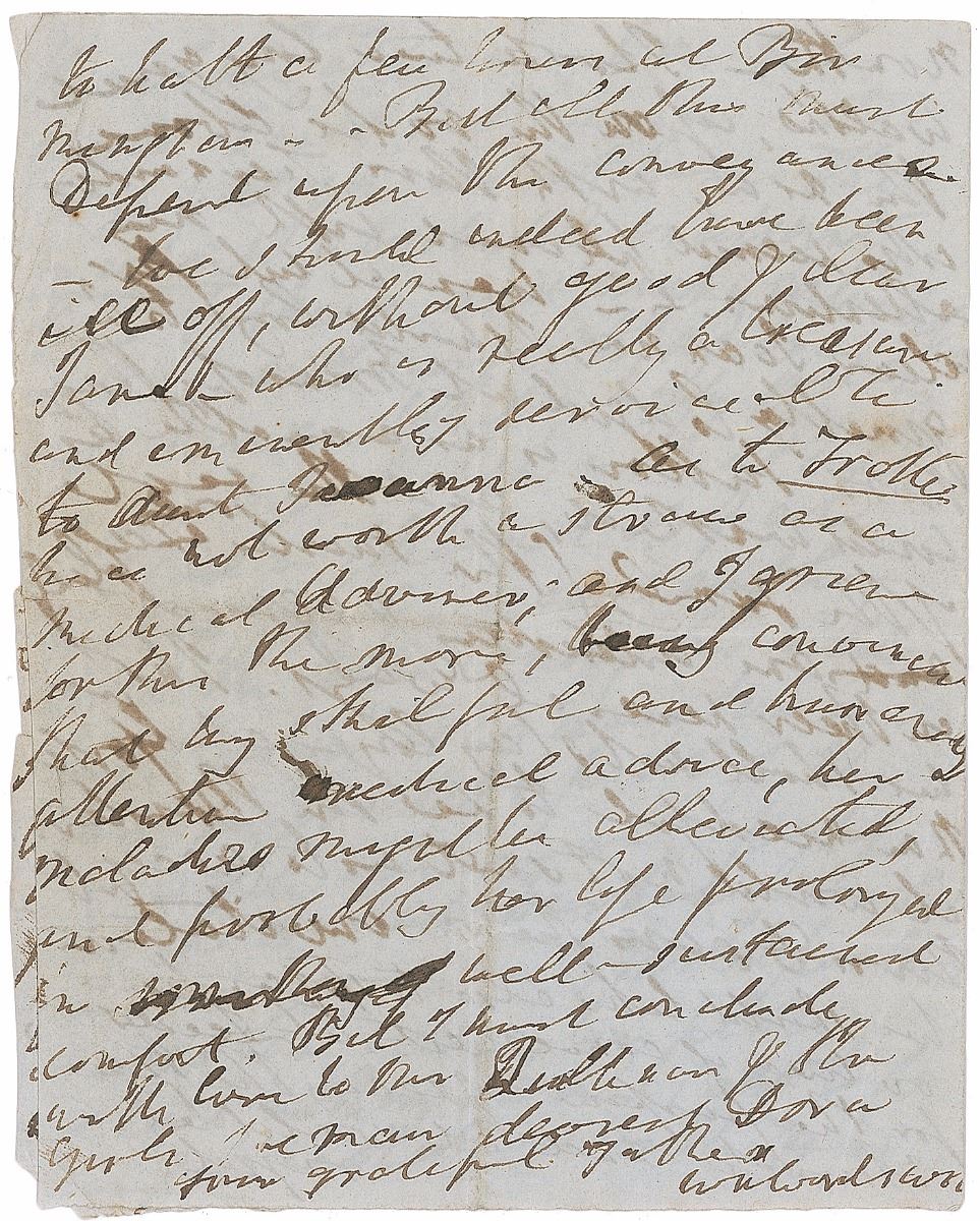 ALS signed “Wm. Wordsworth,” four pages on two adjoining sheets, 4 x 5, no date but circa 1838. Letter to his daughter Dora, in part: “It is well you are not here. The incessant, absolutely incessant loud talking and angry contradictions of George are enough to destroy any ones nerves. What a happy thing for his poor wife that she is deaf. I had a pleasant day at Durham, for George was rambling about the town among his old…acquaintances & others...Hartlepool is also an interesting place, we have nothing on our coastline to compare with it, or with Tyne North—I took two long quiet walks upon the rocks above the sea, with Mrs. Fernandez who seemed pleased with my attentions…Mrs. Sutton is as amicable as could wished, and the rest of the family…are interesting & agreeable in their several ways. I hope we shall not stay longer at York than needful to see the Minister, It would not suit us to accept Mrs. Dixon’s kind invitation. We should also like to stop an hour or two if convenient at Leeds for the purpose of seeing the New Church and it would be right to halt a few hours at Birmingham. But all this must depend on the conveyance—we should indeed have been ill off, without goof & dear Jane—who is really a treasure and eminently serviceable to Aunt Joanna....I must conclude with love to Mr. Quillinan & the girls.” Wordsworth adds a brief postscript asking her to send his love to his sister. Intersecting folds, scattered creasing, small dings and tears to edges, and slight show-through from writing to opposing sides, otherwise fine condition. Accompanied by the original mailing envelope affixed to an off-white 7.25 x 6.75 sheet bearing collector’s ink notations, with a letter from English novelist Charlotte Mary Yonge affixed to the reverse. In the first week of July 1838, Wordsworth traveled northeast to visit members of his wife’s family and then on to the University of Durham to accept an honorary doctorate in civil law. With references to the Hutchinson clan and one Edward Quillinan, Dora’s future husband, this is an exceptionally intimate letter from one of Britain’s most influential poets.