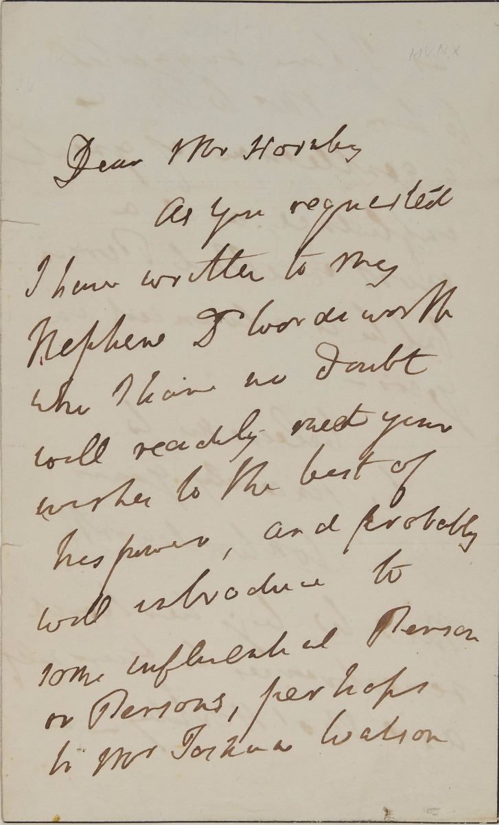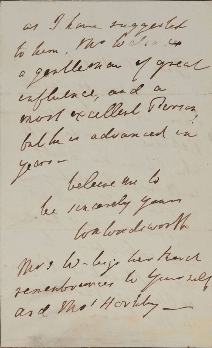 ALS signed “Wm. Wordsworth,” one page both sides, 4.25 x 7, no date. Letter to "Mr. Hornby," in part: "As you requested I have written to my nephew Dr. Wordsworth who I have no doubt will readily treat your wishes to the best of his power, and probably will introduce to some influential person or persons…Mr. W. also is a gentleman of great influence, and a most excellent person, but he is advanced in years." In fine condition, with two very small edge tears and writing showing through from opposing sides.