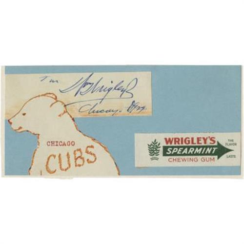 <B>William Wrigley, Jr. Signature</B></I> on card, 3.75 x 1, mounted on stiff paper stock, signed <I>Wm Wrigley Chicago 1929</B></I>. William Wrigley, Jr. (1861-1932) was founder of the chewing gum company that bore his name.. Wrigley was also the owner of the Chicago Cubs baseball team. Fine. <BR><BR><b>Shipping:</b> Flat Material, Small (<a target="_blank" href="http://www.heritageauctions.com/common/shipping.php">view shipping information</a>)