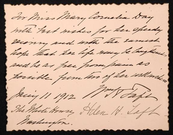 William and Helen Taft On the Same Autograph Note. Autograph note signed ("Wm H. Taft") as President, 3½ x 4½", The White House, Washington, Jan. 11, 1912. Also signed by First Lady Helen H. Taft. Written on a deckle-edged card to Miss Mary Cornelia Day, "with best wishes for her speedy recovery and with the earnest hope that her life may be lengthened and be as free from pain as possible from two of her well wishers." Very fine and most attractive.