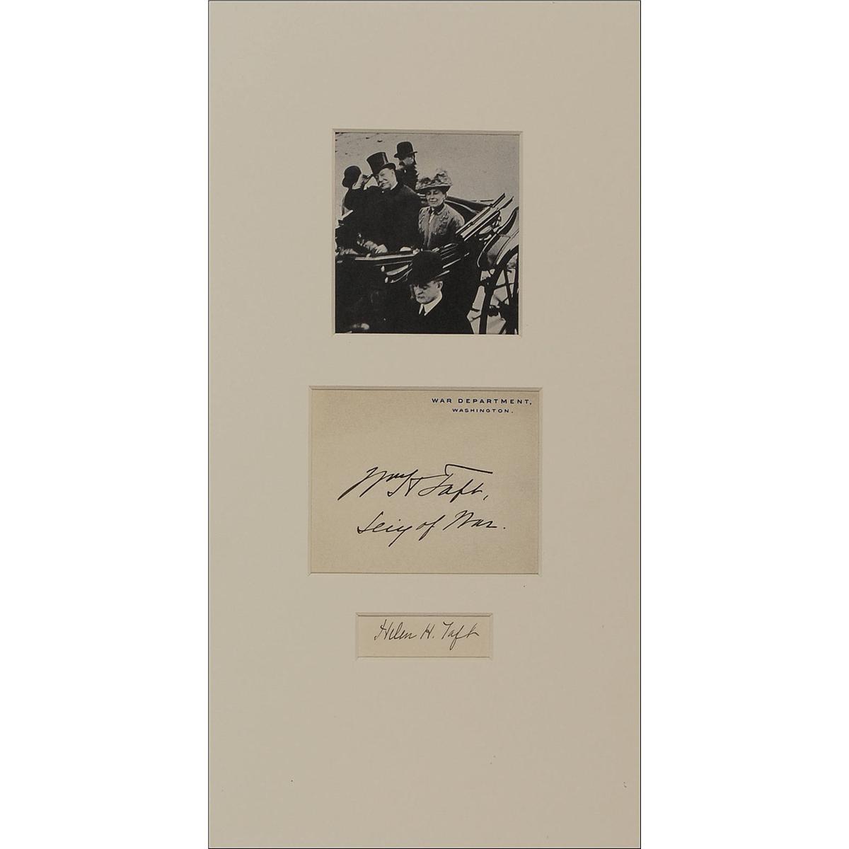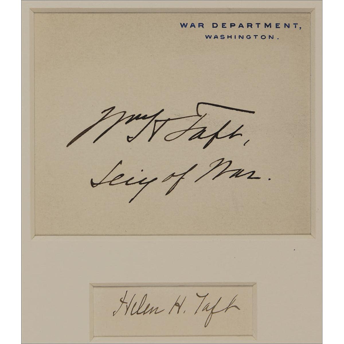Two items: Off-white 4 x 3.25 War Department card signed in fountain pen, “Wm. H. Taft, Secy. of War”; and a fountain pen signature, “Helen H. Taft,” on an off-white 2.25 x .75 slip. Matted with a portrait of the couple to an overall size of 8 x 15.25. In fine condition.