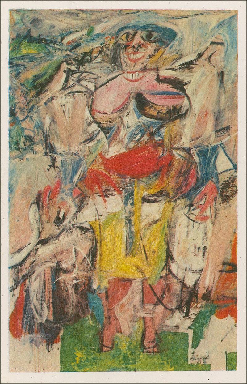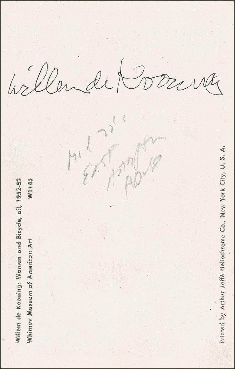 Color 3.5 x 5.5 postcard photo of de Kooning’s painting entitled ‘Woman and Bicycle,’ signed in black ballpoint on the reverse, “William de Kooning.” In fine condition, with a collector’s notation in pencil beneath his name.