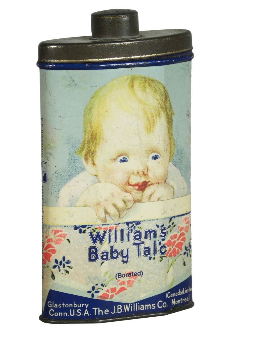 Williams Baby Talc Tin. The J. B. Williams Co. Glasonbury Conn. USA and Canada Limited Montreal. Very minor paint loss and scratches and rust around bottom otherwise excellent condition. 2 3/4 X 5 X 1 inches.