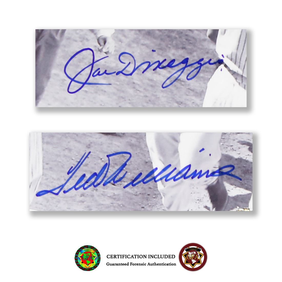 Joe DiMaggio (November 25, 1914 – March 8, 1999) and Ted Williams (August 30, 1918 – July 5, 2002). Boldly signed black and white photograph of Joe DiMaggio and Ted Williams. Signed by each in perfect blue sharpie. In 1941 both had a season for the ages. At the start of the 1941 baseball season, neither Joe DiMaggio of the New York Yankees nor Ted Williams of the Boston Red Sox were beloved by baseball fans. But that all changed when Joe started a 56-game hitting streak and Ted's batting average rose to over .400. Despite numerous challenges along the way-Joe had his bat stolen by an overeager fan and Ted's batting average dipped to .3995 on the last day of the season-the records set by "Joltin' Joe" and "The Splendid Splinter" have yet to be broken. Matted and Framed with color photographs of both Hall of Famers, with an overall size of 18 x 27. Comes with a Letter of Authenticity from Guaranteed Forensic Authenticators (GFA).