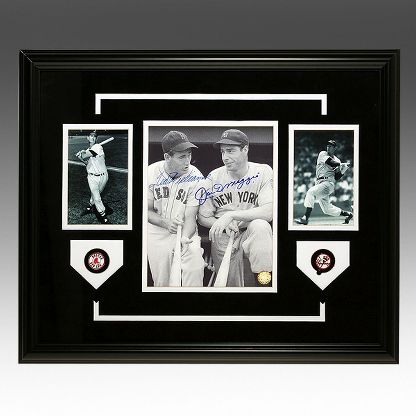 For 10 illustrious seasons, these two legends went head-to-head in direct competition, as they took the ruthless Red Sox vs Yankee rivalry to all new heights. By the time Ted Williams and Joe DiMaggio had finished their story they had combined for 882 home runs, over 4,800 hits, over 3,300 RBIs, 5 MVP awards, 32 All-Star selections, and 2 first ballot inductions into the Baseball Hall of Fame. During their heated rivalry there was constant argument as whether Ted Williams or Joe DiMaggio was the greatest player in the game. That debate was documented further in the pages of the September 1948 edition of Sport Magazine, which is displayed in the center of this historic creation. This gallery room quality design has only been made available in limited production and won't be here for very long. Don't wait any longer to take home this unparalleled showcase of Ted Williams and Joe DiMaggio.