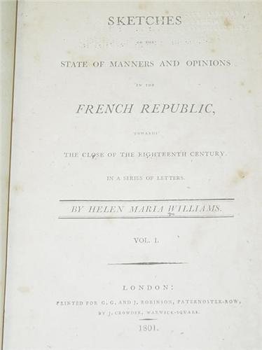 Williams, Helen Maria. Sketches of the State of Manners and Opinions in the French Republic, Towards the Close of the Eighteenth Century. In a Series of Letters - 2 Volumes. London: Printed for G.G. And J. Robinson, 1801. 8vo - over 7¾" - 9¾" tall. Hard Cover. Ex-Library. Good Condition. SCARCE. Vol. 1 - half-title [1] title [1] 2 preface, 4 contents, 325pp. Vol. 2 - half-title, [1] title [1] 4 contents, 352pp. Leather bound with gilt design along outer edges. Covers show edge/corner wear, cloth tape over backstrips, covers detached, occasional foxing. BINDING TIGHT. Williams, supporter of abolitionism, imprisoned in Paris during the Reign of Terror, holds an attachment to the original French ideals of the French Revolution, while opposing the rise of Napoleon.