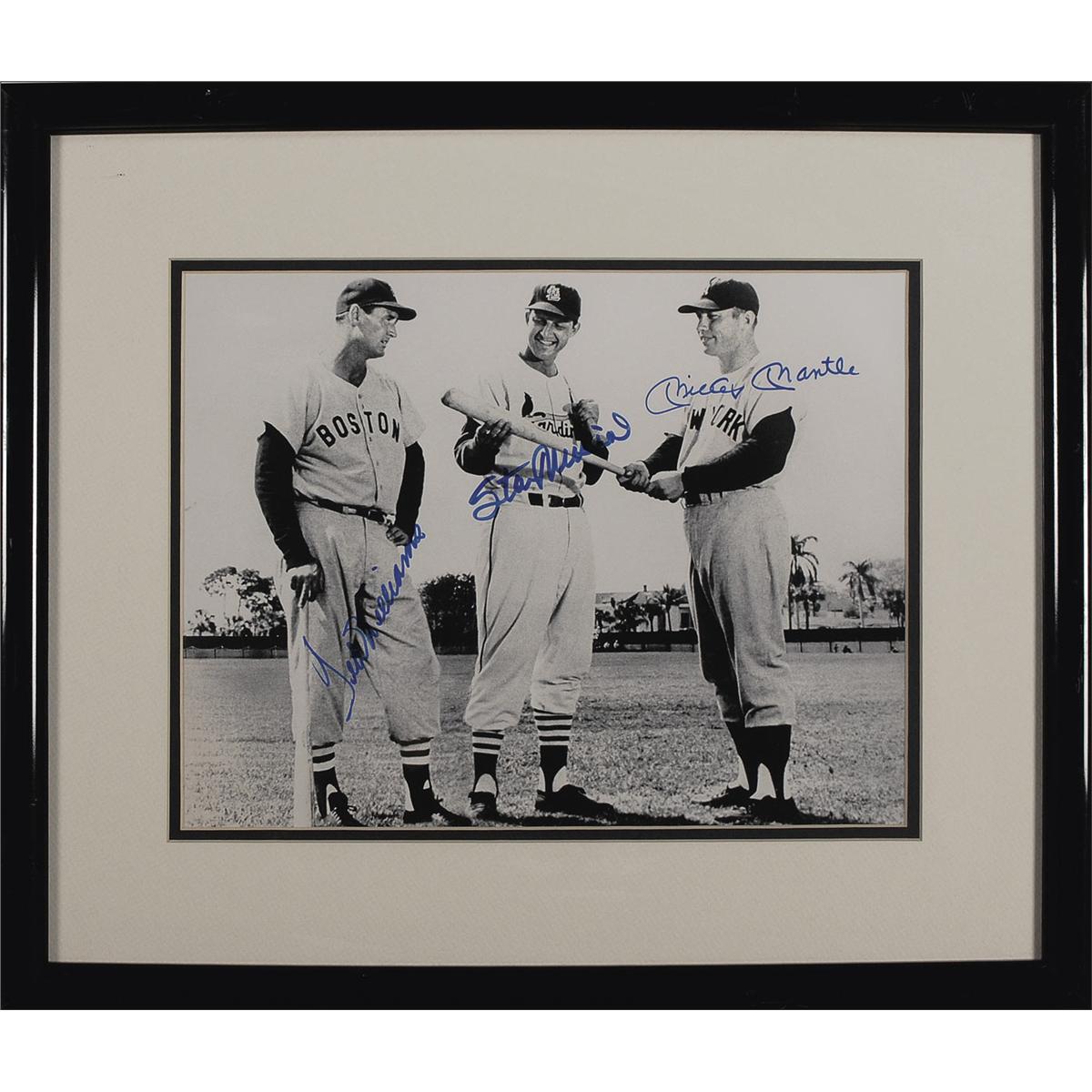 Satin-finish 13.5 x 10.5 photo Mickey Mantle, Stan Musial, and Ted Williams chatting during spring training, signed in blue felt tip by all three. Double matted and framed to an overall size of 20.5 x 17.5. In very fine condition.