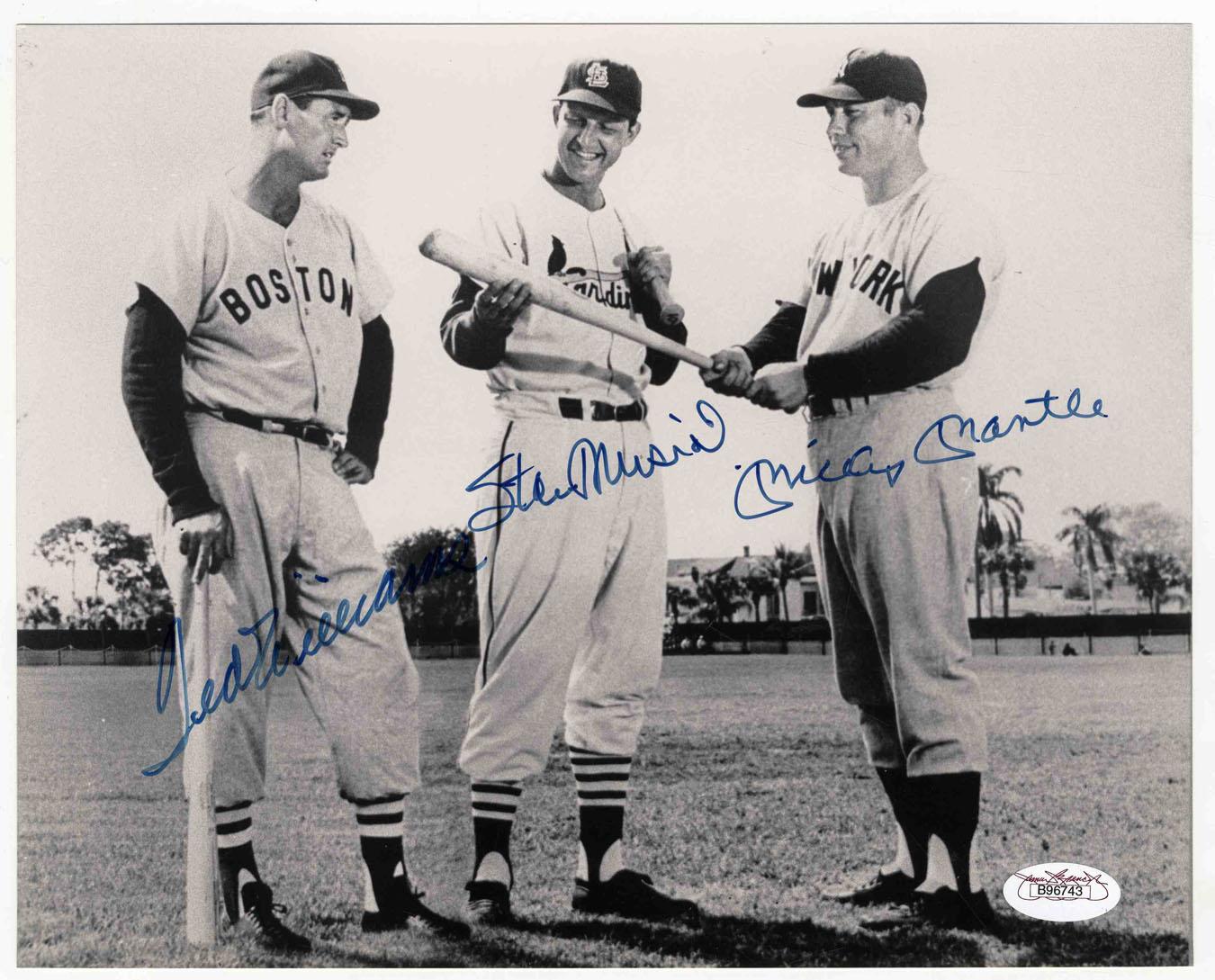 Photo signed by Ted Williams, Mickey Mantle and Stan Musial. Photo shows players in a jovial mood. All signatures in blue ink and very bold, each signed directly on their own image. Black and white photo measures 8'' x 10''. Fine condition. With JSA COA.