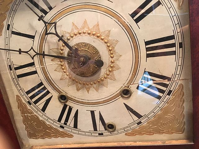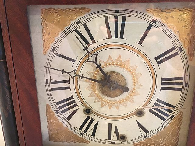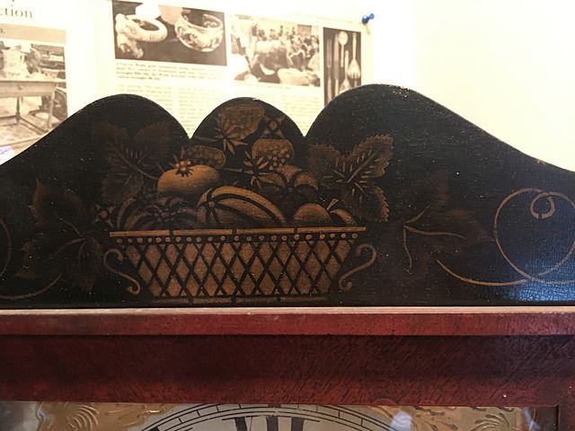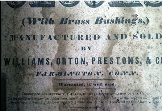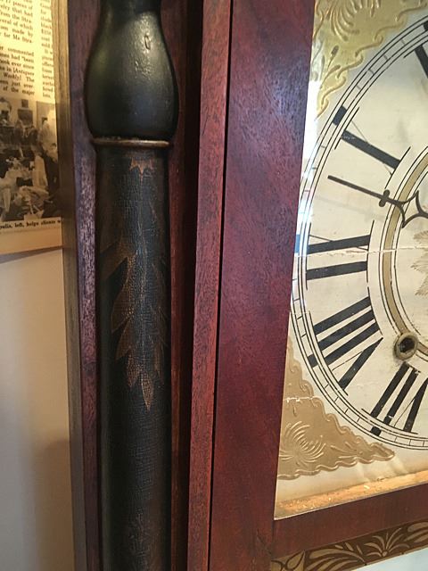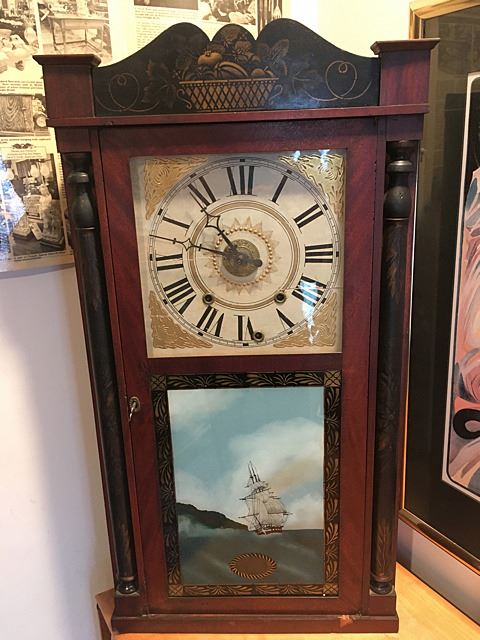Williams, Orton, Prestons, & Co. Column and Splat Shelf Clock, Farmington, CT. Mahogany shelf clock with stenciled columns and splat, fruit bowl stenciled splat, leaves stenciled on half columns, beautiful hand painted wooden raised gold gilt dial with roman numerials, diamond open faced hands, stenciled and reverse painted glass of sailing ship, very nice label "Manufactured and Sold by Williams, Orton, Prestons, & Co., Farmington, Conn. Measures approx. 32" tall x 16 1/2" wide x 5" deep. Very rare Farmington, CT maker!