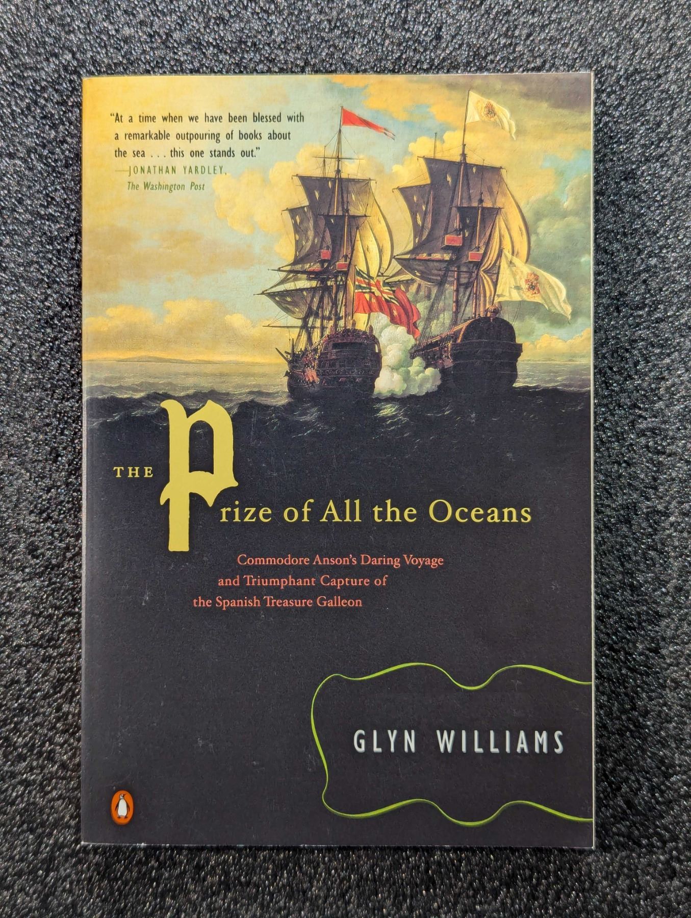 Williams, Glyn. THE PRIZE OF ALL THE OCEANS - COMMODORE ANSON'S DARING VOYAGE AND TRIUMPHANT CAPTURE OF THE SPANISH TREASURE GALLEON. Penguin Books, New York. 2001. 8vo. xxii, 264, (2) pages. original pictorial card covers. Frontispiece painting. Appendices. Maps. B&w photos and illustrations throughout. English text. The David Baker Library. Fine. The action-packed true story of Commodore Anson's legendary 1740 mission to capture a Spanish galleon on the high seas chronicles the British officer's subsequent disastrous campaign that resulted mutiny, starvation, and heroism. Lot weight: 0 lbs 12oz. Subject(s): Maritime History.