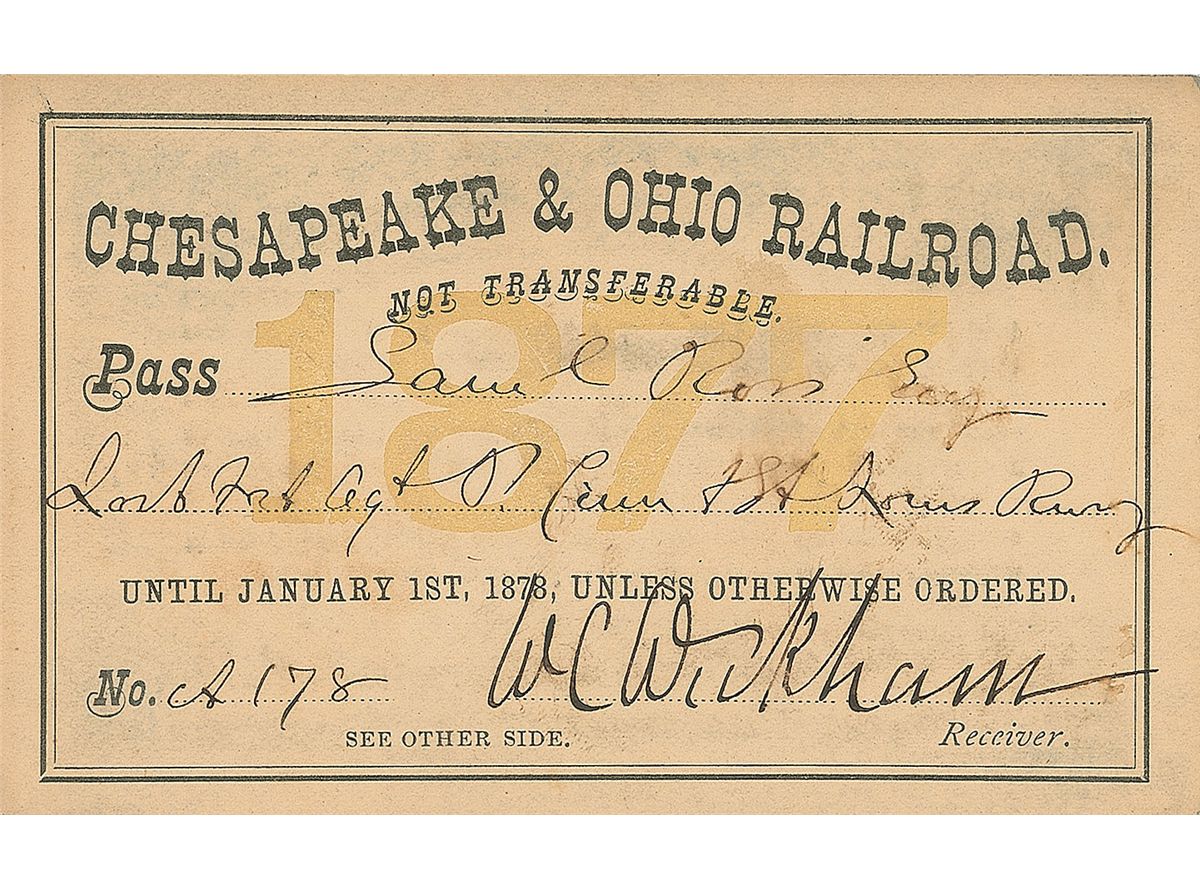 Lawyer, judge, politician, and important Confederate cavalry general who fought in the Virginia campaigns (1820–1888). Pass for the Chesapeake & Ohio Railroad issued to Samuel Ron circa 1877, 3.75 x 2.25, crisply signed at the bottom by Wickham as receiver, “W. C. Wickham.” In fine condition.