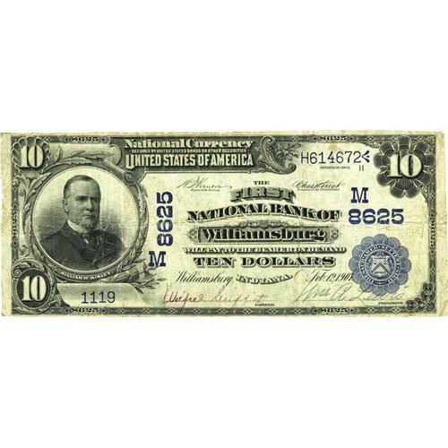 <B>Williamsburg, IN</B></I> - $10 1902 Date Back Fr. 618 <B>The First NB</B></I> Ch. # (M)8625<BR>An extremely scarce bank which has had just four appearances of any kind, large or small, at public sale during the past six decades. This is one of only two Date Backs known from here. <B>Fine-Very Fine.</B></I>