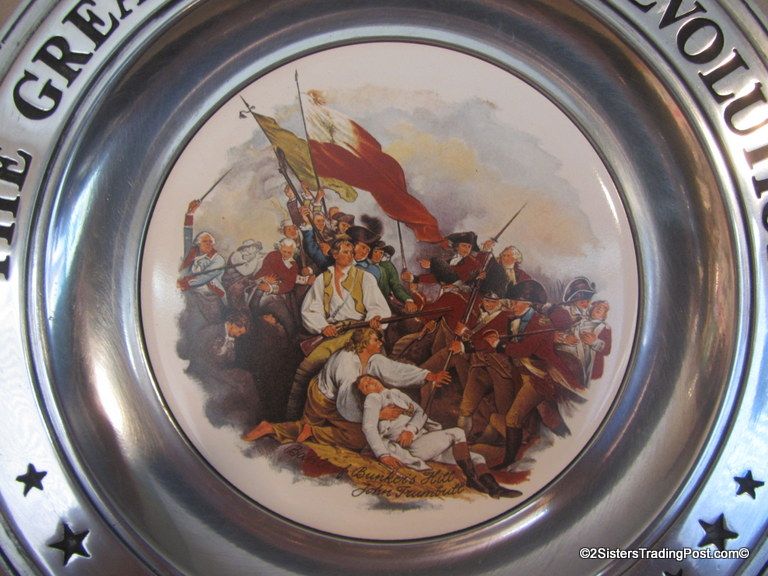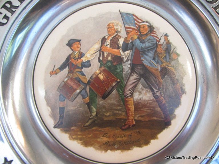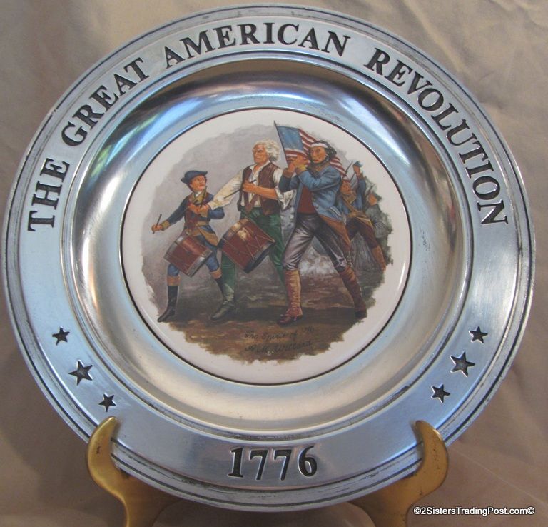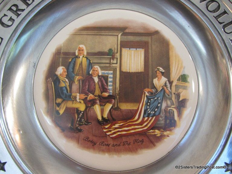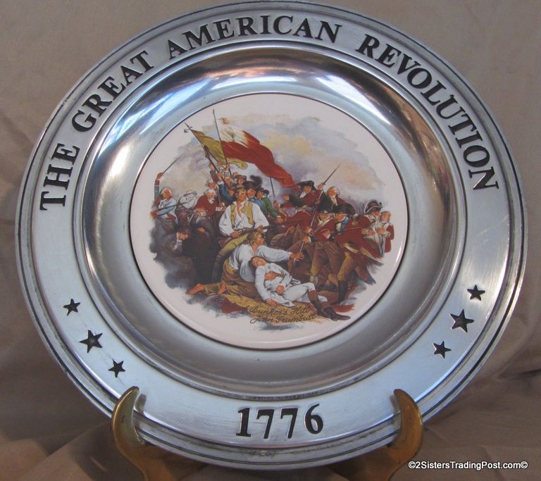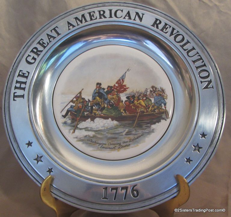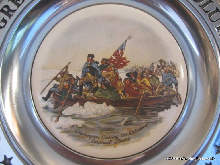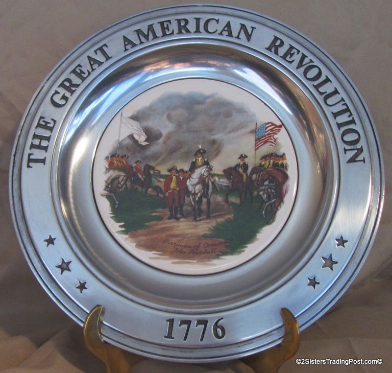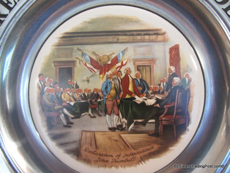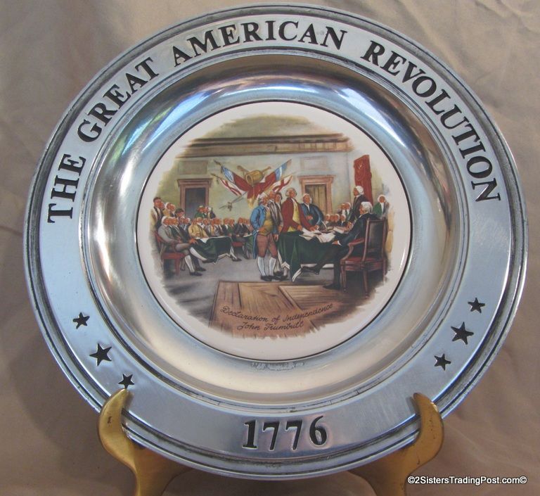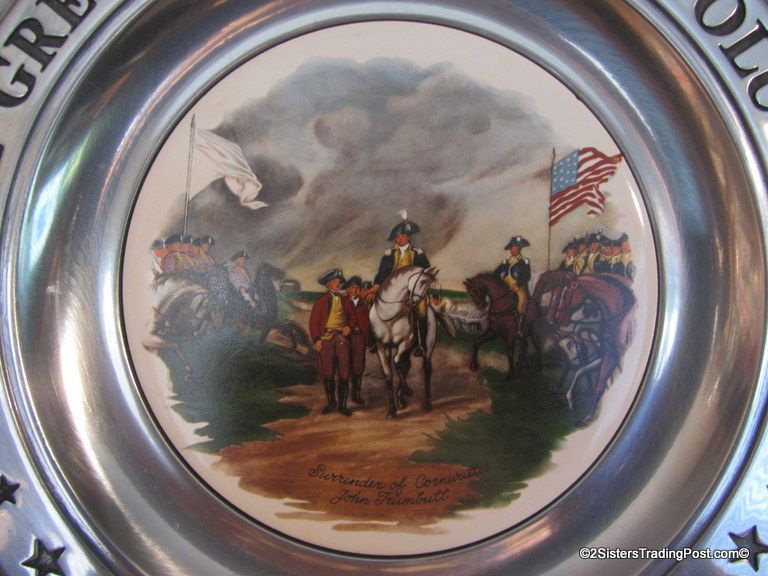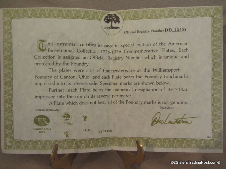 Complete set of six Williamsport Foundry Canton, Ohio. American Bicentennial Collection pewter and porcelain plates. The set includes 'The Signing of the Declaration of Independence' John Trumbull artwork, 'Spirit of '76'' A. M. Willard artwork, 'Washington Crossing the Delaware' Emmanuel Leutze artwork, 'Betsy Ross and the American Flag' artist unknown, 'Battle of Bunker Hill' John Trumbull artwork and 'Surrender of Cornwallis; John Trumbull artwork. Comes with the history and information pamphlet and the Official Registry Number Certificate. Plates are in mint condition look to be NIB and come in the original postmarked box Dated March 24, 1975 (Please see images for details)