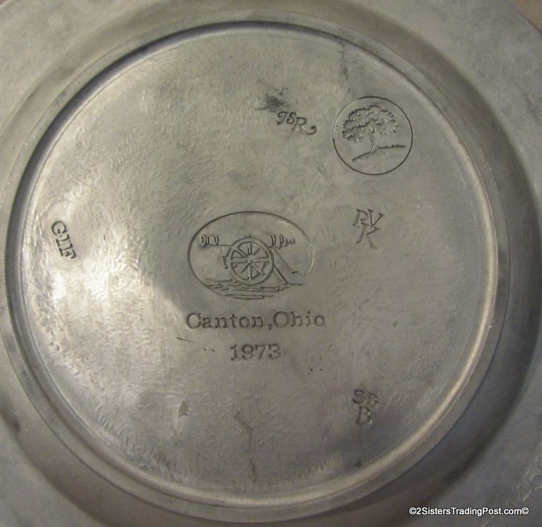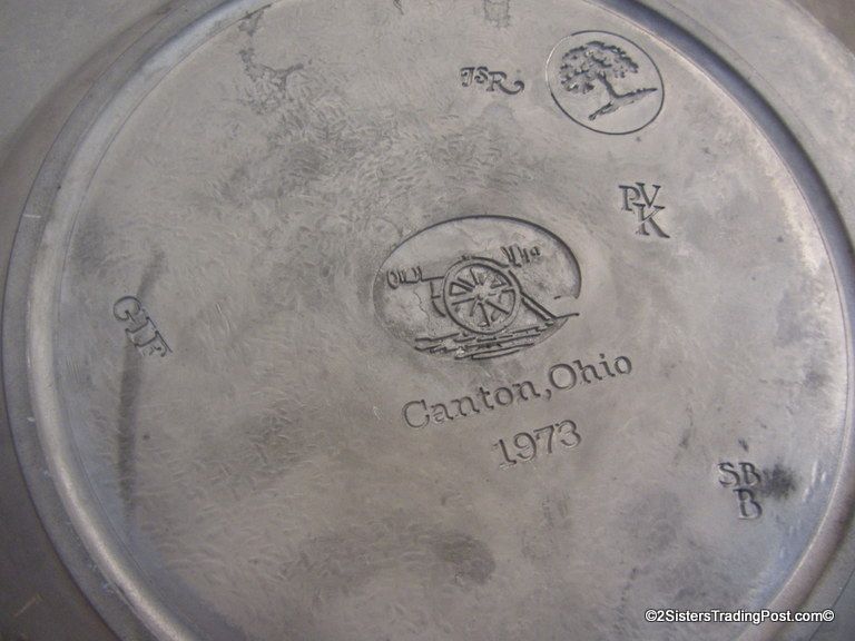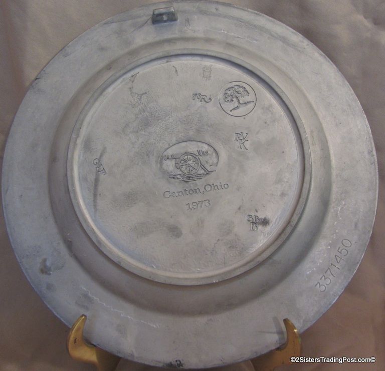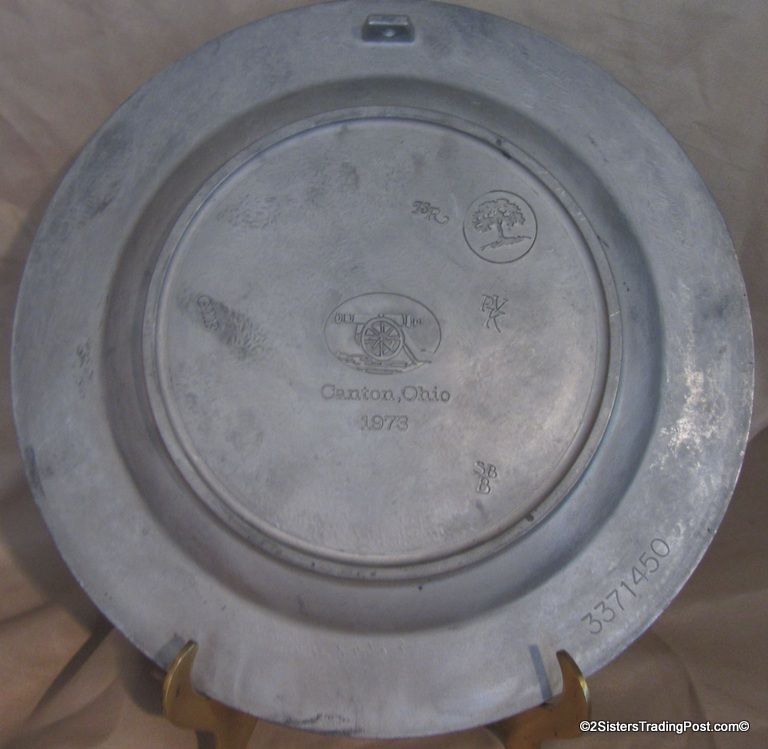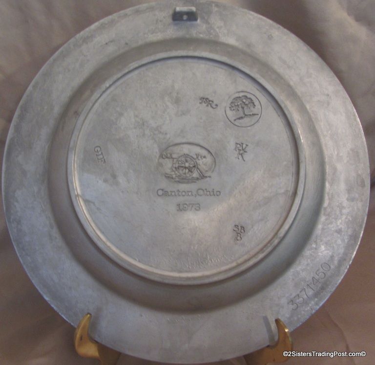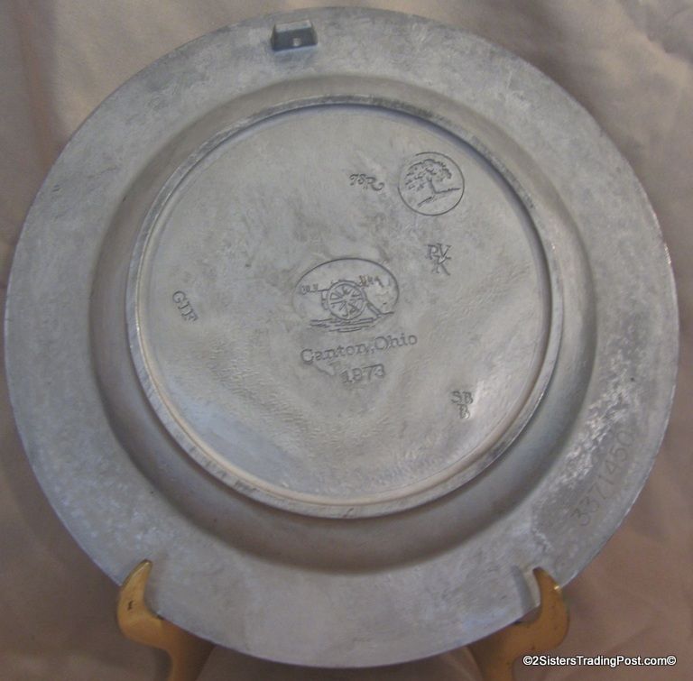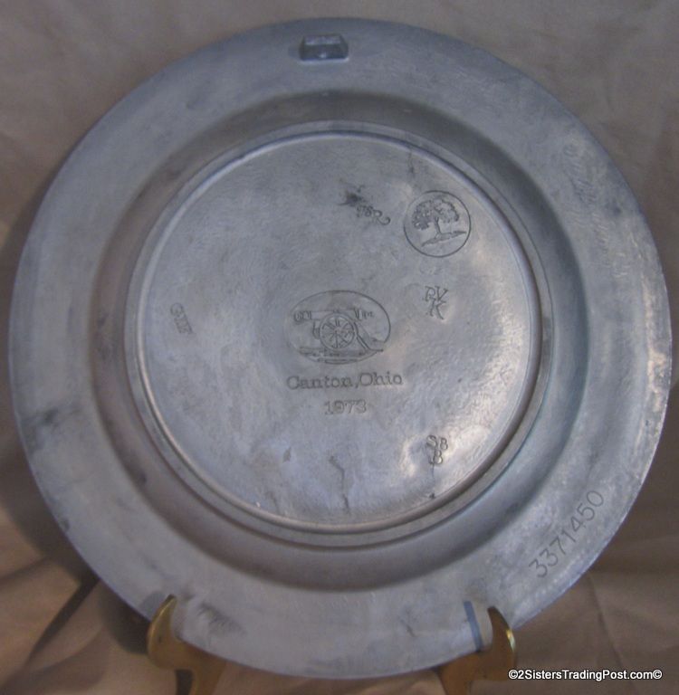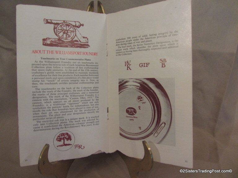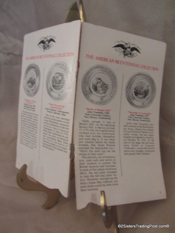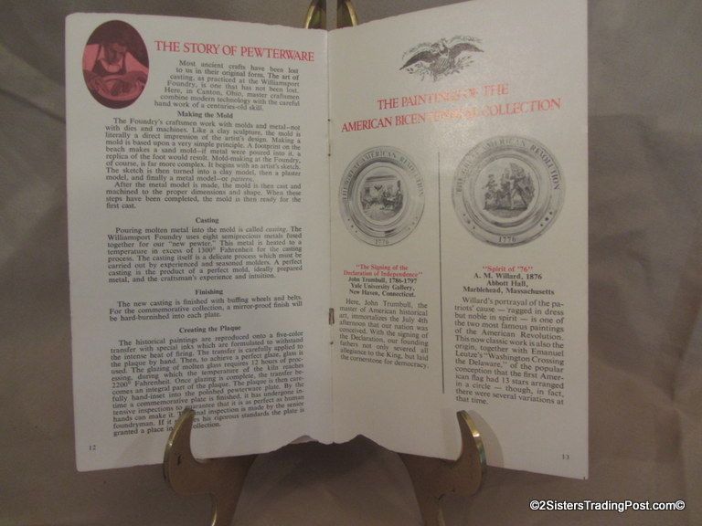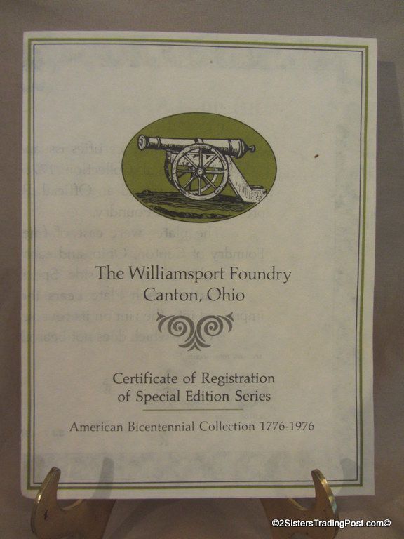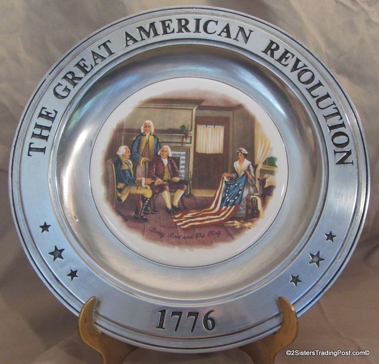 Complete set of six Williamsport Foundry Canton, Ohio. American Bicentennial Collection pewter and porcelain plates. The set includes 'The Signing of the Declaration of Independence' John Trumbull artwork, 'Spirit of '76'' A. M. Willard artwork, 'Washington Crossing the Delaware' Emmanuel Leutze artwork, 'Betsy Ross and the American Flag' artist unknown, 'Battle of Bunker Hill' John Trumbull artwork and 'Surrender of Cornwallis; John Trumbull artwork. Comes with the history and information pamphlet and the Official Registry Number Certificate. Plates are in mint condition look to be NIB and come in the original postmarked box Dated March 24, 1975 (Please see images for details)