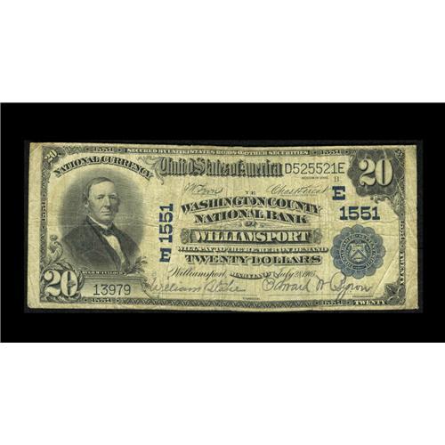 <B>Williamsport, MD</B></I> - $20 1902 Plain Back Fr. 651 <B>The Washington County NB</B></I> Ch. # (E)1551<BR>This is from a scarce one bank town. <B>Fine.</B></I>