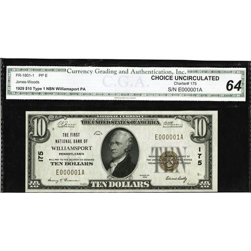 <B>Williamsport, PA</B></I> - $10 1929 Ty. 1 <B>The First NB</B></I> Ch. # 175<BR>A Serial #1 example certified as <B>CGA Choice Uncirculated 64,</B></I> a grade we feel is right on the money. Williamsport is well known as the home of the Little League World Series. Tonight's offering is especially bright and offers premium level aesthetic appeal. Serial #1 notes enjoy an historically high level of demand in the current marketplace and are an enhancement for whatever collection they enter.