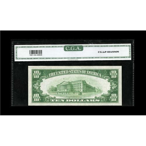 48B. CURRENCY – Notes sold referencing a third-party grading service are sold "as is" without any express or implied warranty, except for a guarantee by Auctioneer that they are genuine. Grading, condition or other attributes of any lot may have a material effect on its value, and the opinion of others, including independent grading services such as PCGS Currency, PMG, and CGA may differ with that of Auctioneer. Auctioneer shall not be bound by any prior or subsequent opinion, determination, or certification by any independent grading service. The grades assigned by any grading service to any note offered in any Heritage Currency Auctions of America sale represent the opinion of that grading service only,and may differ in material respects from the grade assigned to the same note in previous sales by HCAA or other auction companies, or from the grade that would be assigned by any other grading service. HCAA is unable to view any third party graded item outside of the holder, and specifically disclaims any liability of any kind to bidders who bid on third party graded items for mistakes of commission or omission by any grading service. Bidders are hereby notified that currency grading standards have changed in the past and are subject to change in the future, and that the only remedy bidder has with respect to third party graded notes is to deal directly with the grading service certifying the item. Bidders are also advised that Auctioneer makes no representation or guarantee that any item obtained by Bidder will be assigned any particular grade by any particular grading service, and as noted herein, Bidder specifically waives any claim to right of return of any item because of the opinion, determination, or certification, or lack thereof, by any independent grading service. Certain warranties may be available from the grading services and the Bidder is referred to them for further details: Paper Money Guaranty (PMG), PO Box 4711, Sarasota FL 34230; PCGS Currency, PO Box 9458, Newport Beach, CA 92658; Currency Grading & Authentication (CGA), PO Box 418, Three Bridges, NJ 08887.