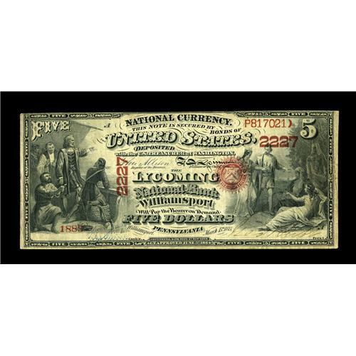 <B>Williamsport, PA</B></I> - $5 Original Fr. 399 <B>The Lycoming NB</B></I> Ch. # 2227<BR>This is the only Original Series example of any denomination known to exist from this scarcer Williamsport bank, with this note displaying the charter number, indicating its printing after June of 1874. Nice <B>Fine-Very Fine.</B></I><BR><BR><b>Shipping:</b> Coin/Currency (<a target="_blank" href="http://www.heritageauctions.com/common/shipping.php">view shipping information</a>)