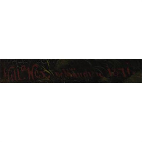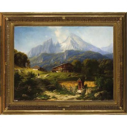 <B>WILLIBALD WEX (German, 1831-1892)</B></I><BR><I>An Alpine Farm</B></I>, 1871<BR>Oil on canvas<BR>34 x 45 inches (86.4 x 114.3 cm)<BR>Signed lower left: <I>"Will. Wex Munchen 1871"</B></I><BR> <BR>PROVENANCE:<BR>N.M. Vose Gallery, Providence, Rhode Island, Inv.#6065B (label verso);<BR>Skinner, September 26, 1997, lot 212<BR><B>Condition Report:</B> Original, unlined canvas, canvas slack in frame; scattered losses to perimeter of canvas; otherwise very good condition.<BR><BR><b>Shipping:</b> Framed - without Glass, Medium (<a target="_blank" href="http://www.heritageauctions.com/common/shipping.php">view shipping information</a>)