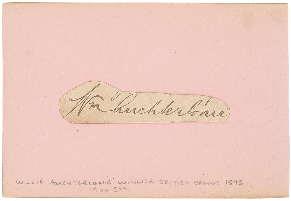 Scottish golfer (1872-1963). He was a native of the "Home of Golf" St. Andrews. He won the 1893 Open Championship, at the age of 21 years and 24 days and he remains the second youngest Open Champion. Very rare vintage fountain pen signature, “Wm. Auchterlonie,” on a closely trimmed off-white slip, affixed to a 6 x 4 light pink album page. In fine condition, with some mild toning and soiling.