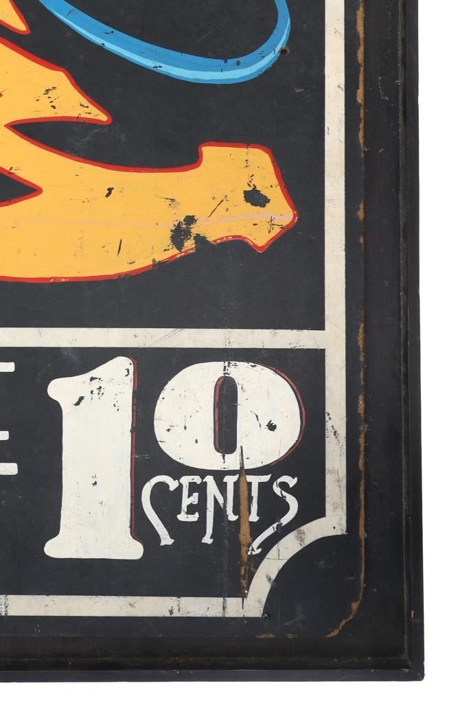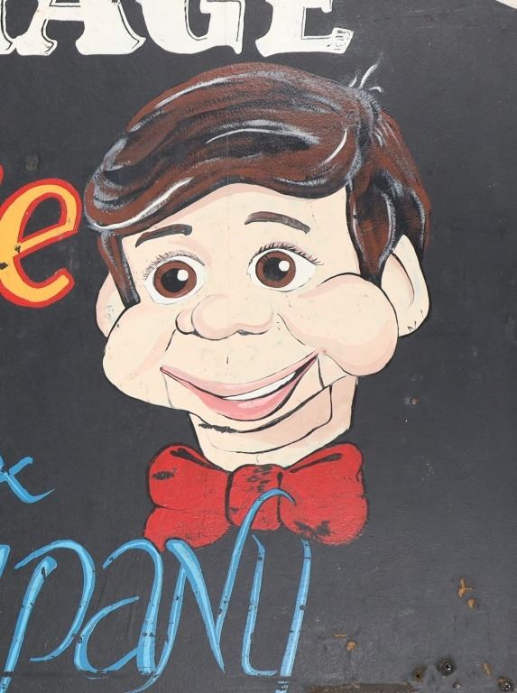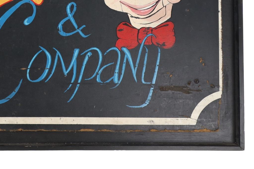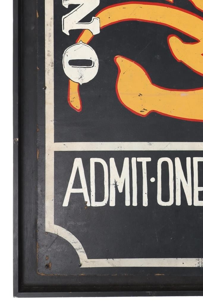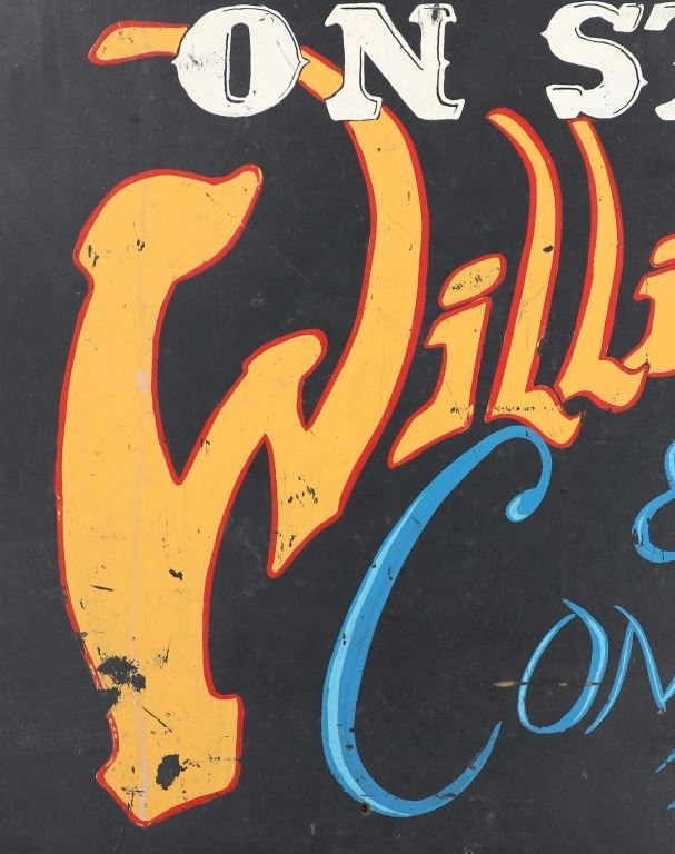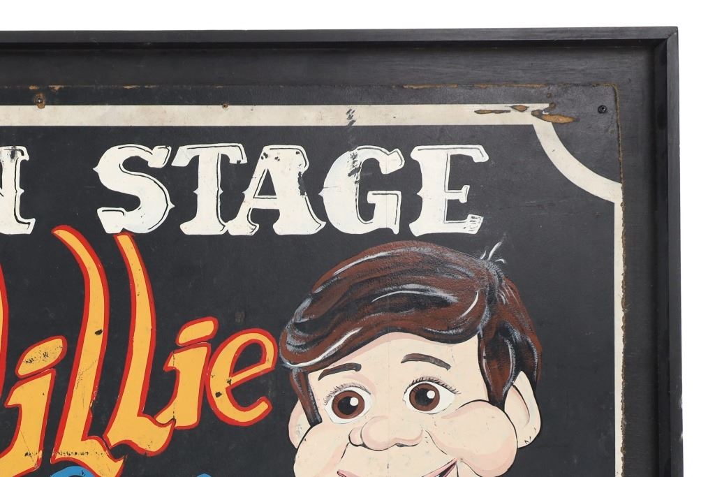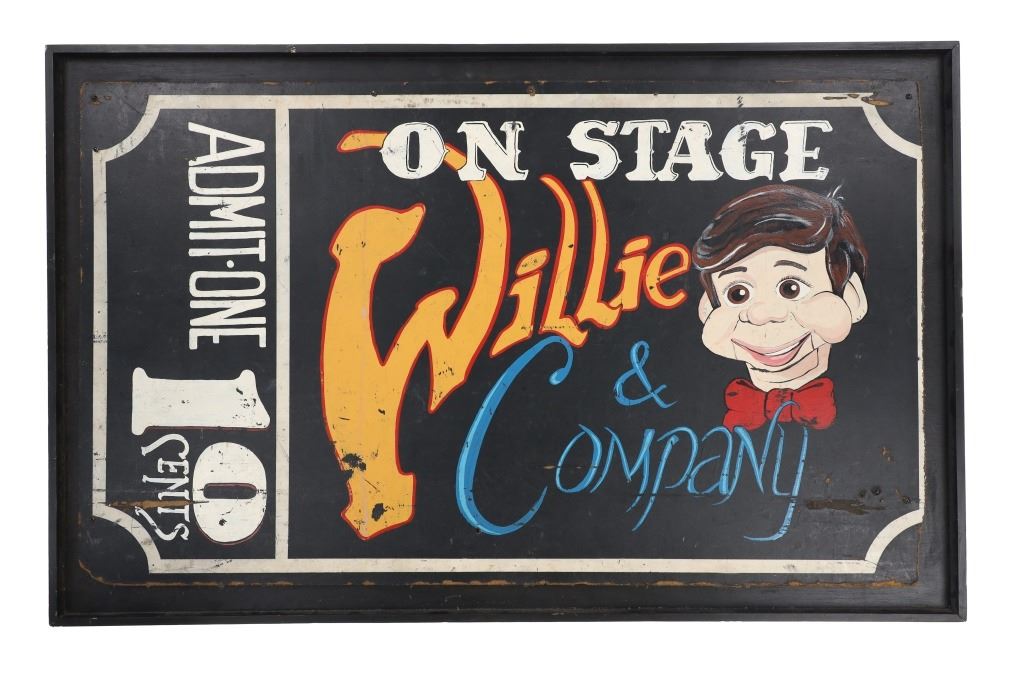 Featured in this lot is a Willie and Company Ventriloquist advertisement sign, circa 1920s. The sign features a wonderfully and professionally crafted painted particle board and wooden frame construction. The sign shows a ventriloquist puppet with the advertisement reading as follows: On Stage - Willie & Company - Admit one - 10 Cents. The condition of this framed show advertisement sign is preserved with some scratches to the paint of the frame and wear tot he particle board of the sign in the corners and to the paint of the sign. The measurements of this framed sign are 33" x 52".*
