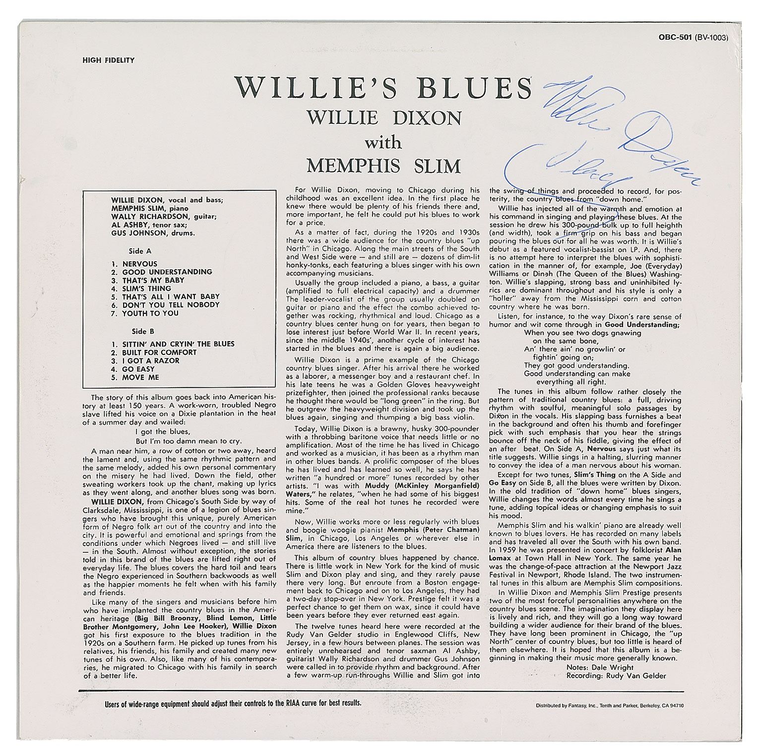 Willie's Blues album by Willie Dixon and Memphis Slim, signed on the back cover in blue ballpoint by Dixon. In fine condition. The record is included. Accompanied by an unsigned publicity photo.