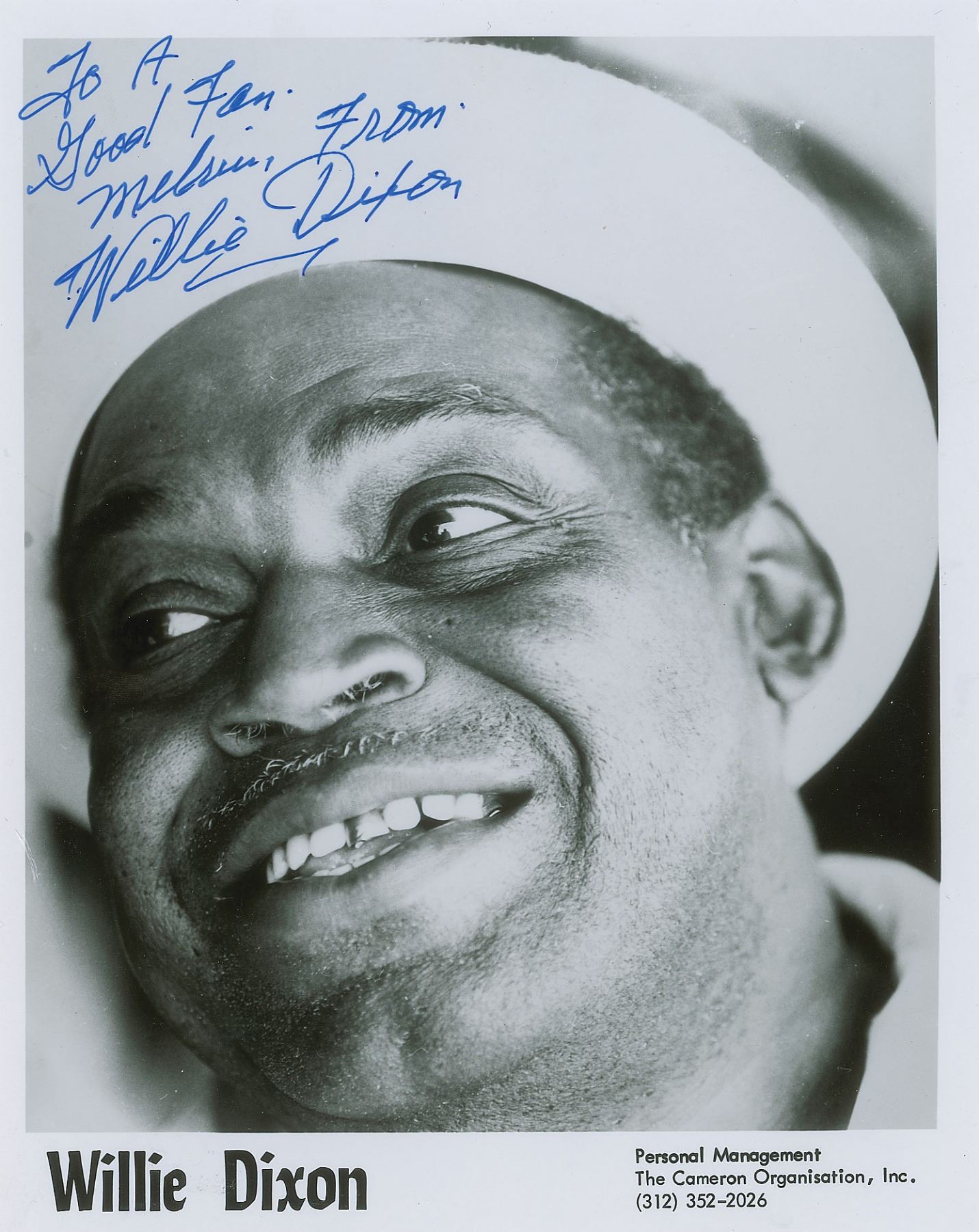 Glossy 8 x 10 close-up publicity photo, signed and inscribed in blue felt tip, "To a Good Fan, Melvin, From Willie Dixon.” In fine condition.