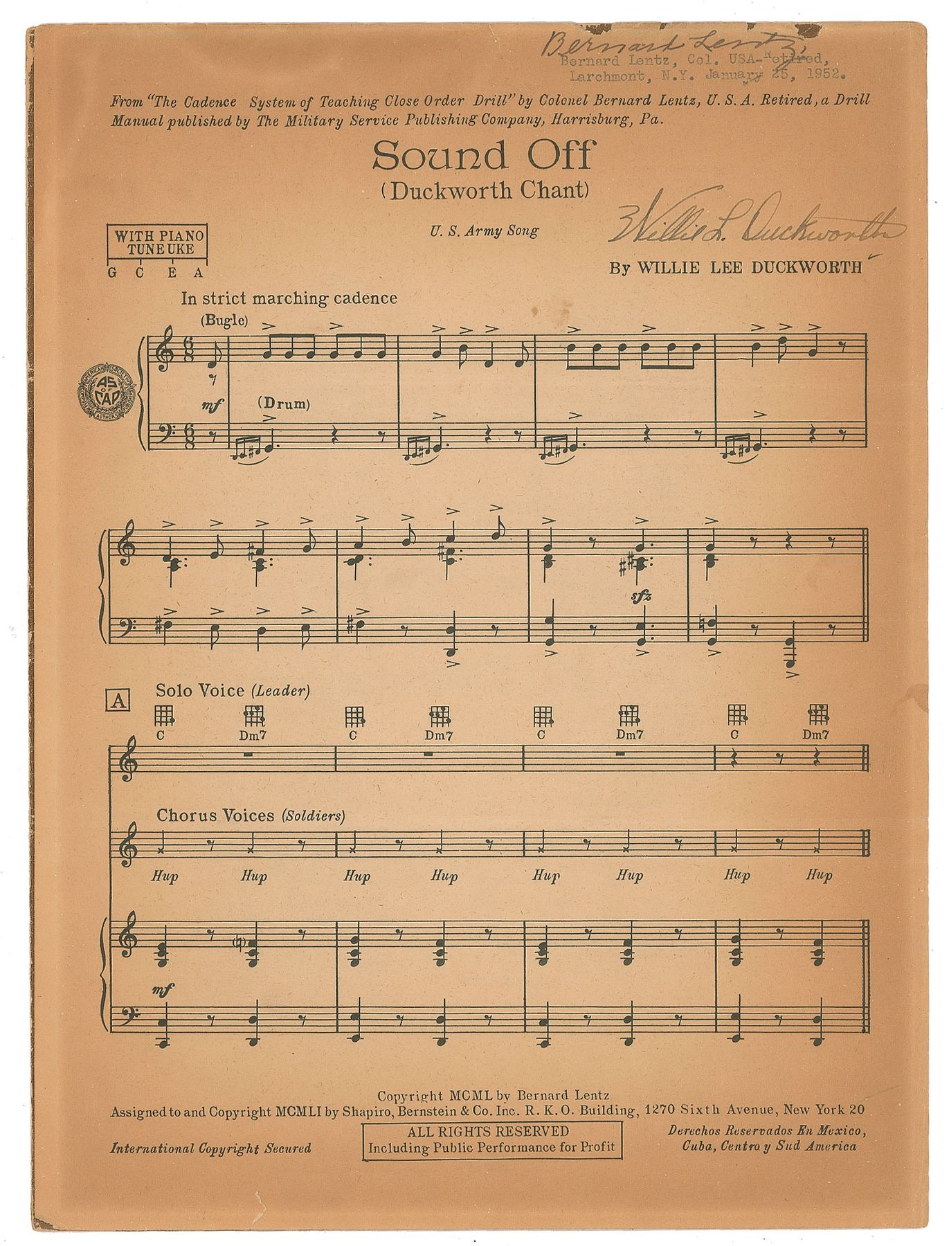 Sheet music for 'Sound Off (Duckworth Chant),' five pages, 8.75 x 12, signed on the first page of music by the composer, "Willie L. Duckworth." Also signed by Col. Bernard Lentz, who standardized the use of cadence calls in the military. In very good to fine condition, with irregular toning, and chipping to the top edge.