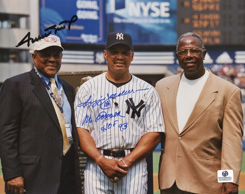 Hand-signed in felt-tip pen by Willie Mays (Giants HOF) and Reggie Jackson (Yankees HOF). Reggie Jackson inscribed "Mr. October" and "HOF 93." Autograph includes an Global Authentics (GA) hologram and matching COA for authenticity purposes.