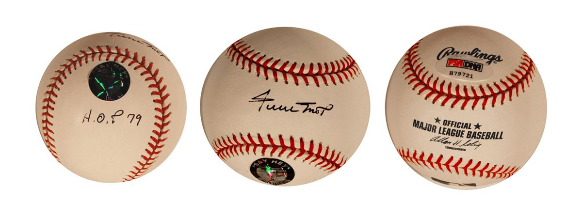 Willie Mays baseball signed. Official Major League baseball is signed ''Willie Mays / HOF 79'', with signature on the sweet spot of the Rawlings brand ball. Near fine. Included is Mays' famous ''Say Hey'' hologram as well as a PSA/DNA COA.
