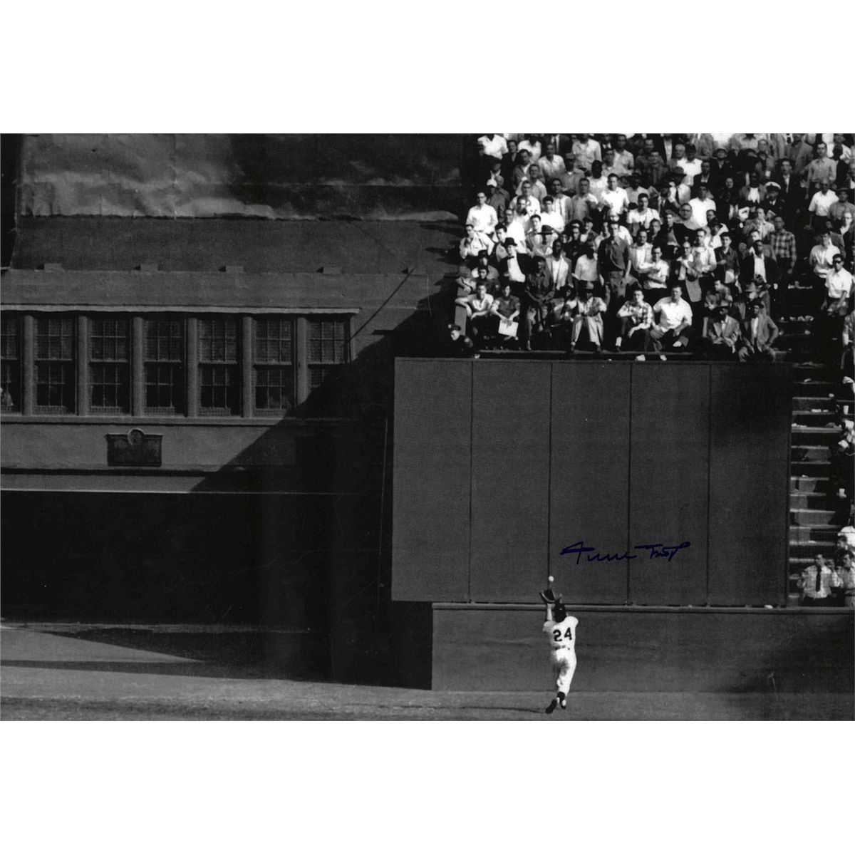 Stunning 20'' x 16'' signed photo of Willie Mays' historic 1954 World Series ''Catch,'' that vaulted the New York Giants to victory. Photo signed by Mays in blue Sharpie above his image. In near fine condition with Mays' official ''Say Hey'' hologram sticker to lower right corner.