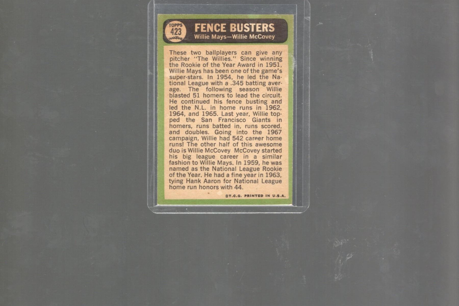 Willie Mays & Willie McCovey 1967 Topps Fence Busters #423 in Very good condition.