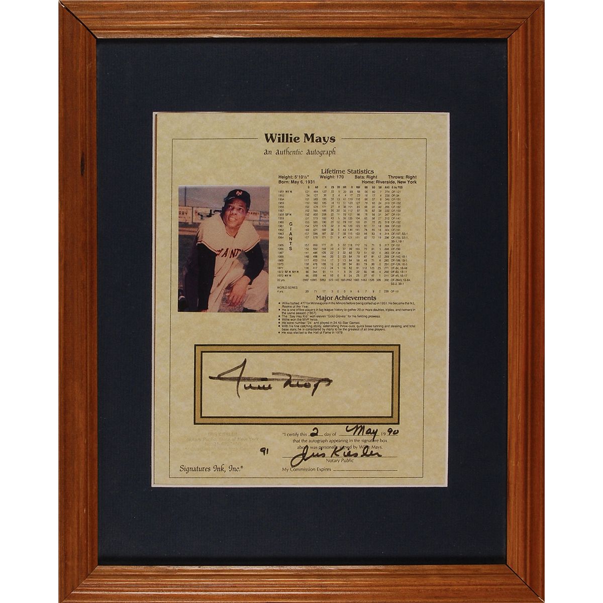 Notarized lifetime statistic sheet, 8 x 10, with a 2.25 x 3 color image on the left side, signed in black felt tip in a prepared blank area near the bottom of the sheet. Matted and framed to an overall size of 12.5 x 15.5. In fine condition.