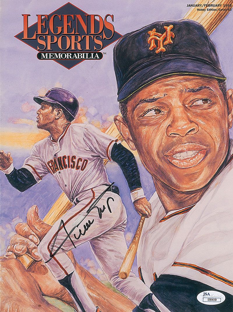 Legends Sports memorabilia magazine, dated January/February 1995, featuring a composite image of an artist’s rendition of Mays on the cover, signed on the front cover in black felt tip. In fine condition, with a James Spence authentication label affixed to lower corner. Accompanied by a certificate of authenticity from James Spence.