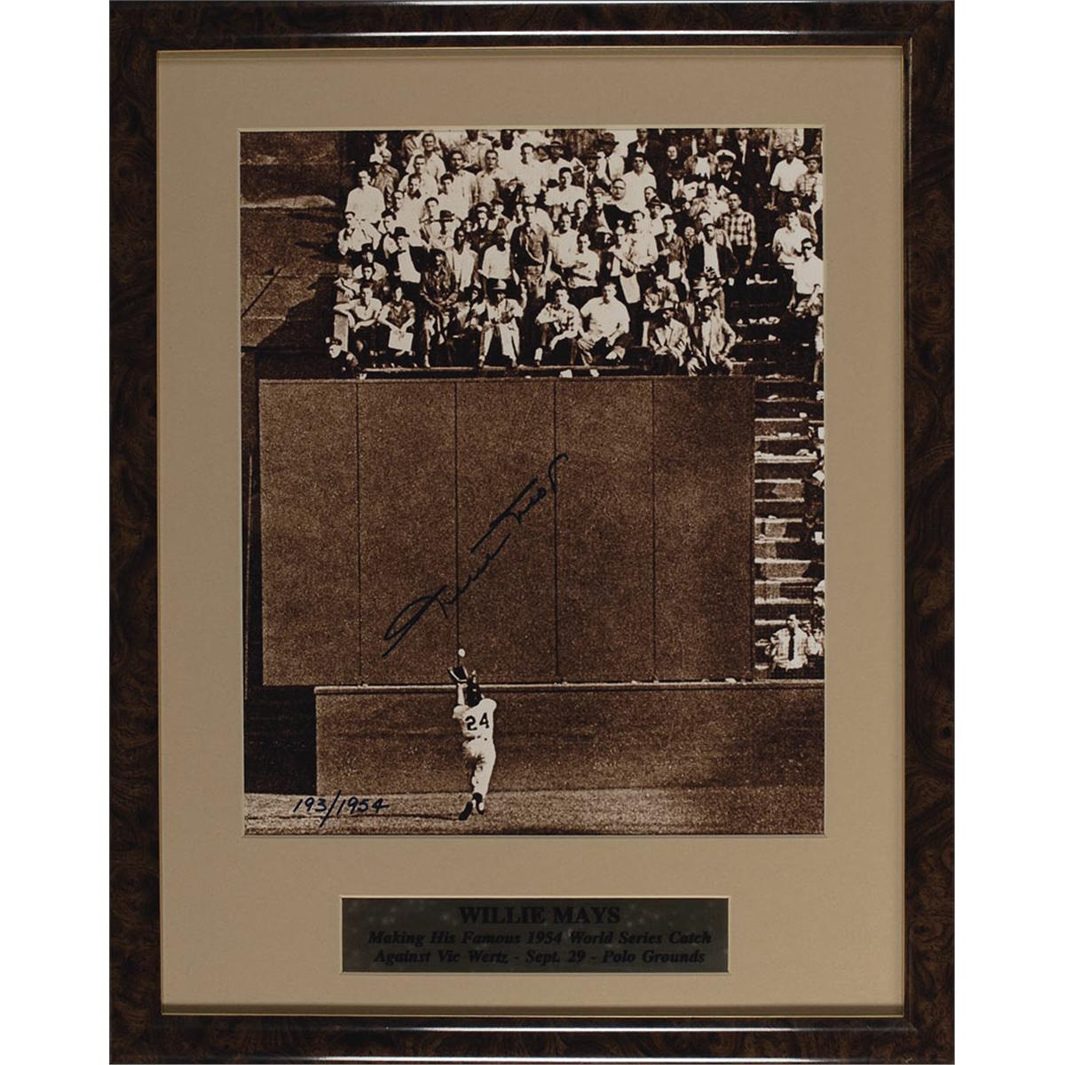 Limited edition satin-finish 10.5 x 13 photo of Mays making his famous 1954 World Series catch against Vic Wertz, #193/1954, signed in blue felt tip. Matted and framed with a descriptive plaque to an overall size of 15.5 x 19.5. In very fine condition.