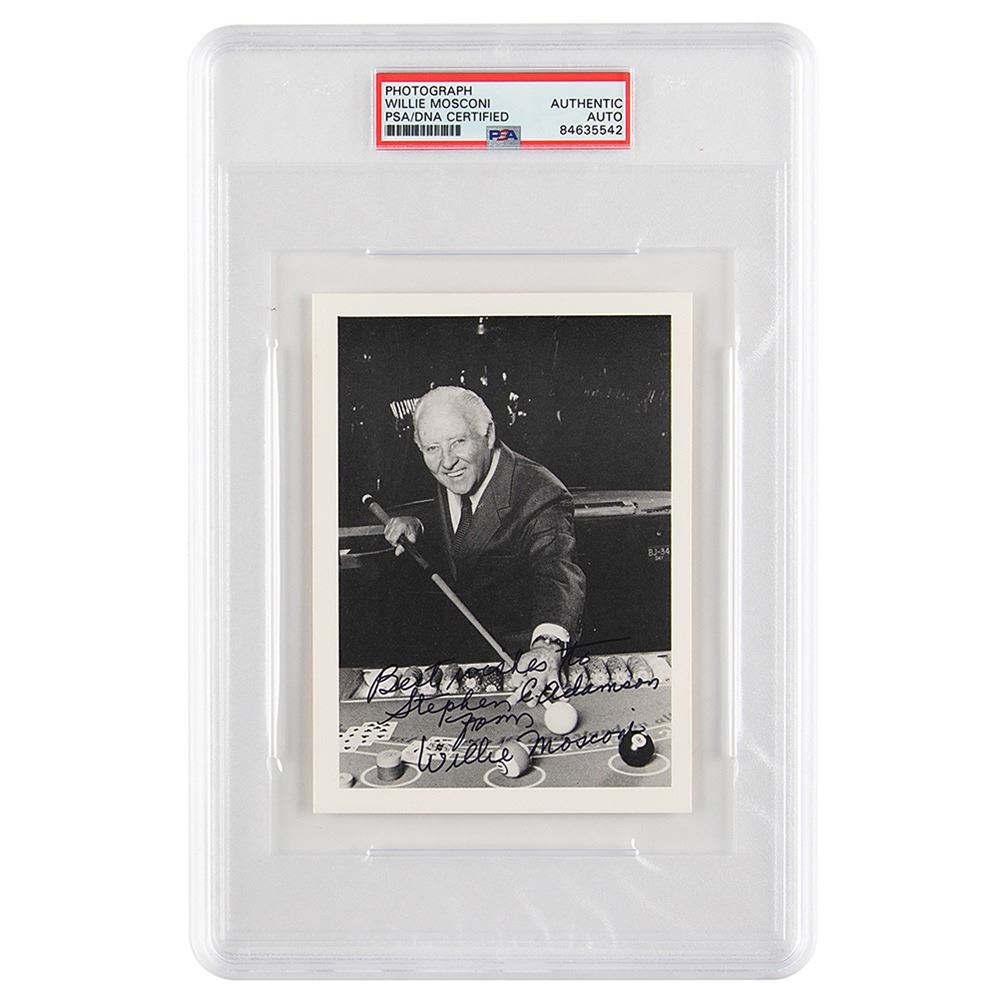 Semi-glossy 4 x 5.5 cardstock photo of Mosconi at the pool table, signed and inscribed in black felt tip, "Best wishes to Stephen C. Adamson, from, Willie Mosconi.†In fine condition. Encapsulated in a PSA/DNA authentication holder.