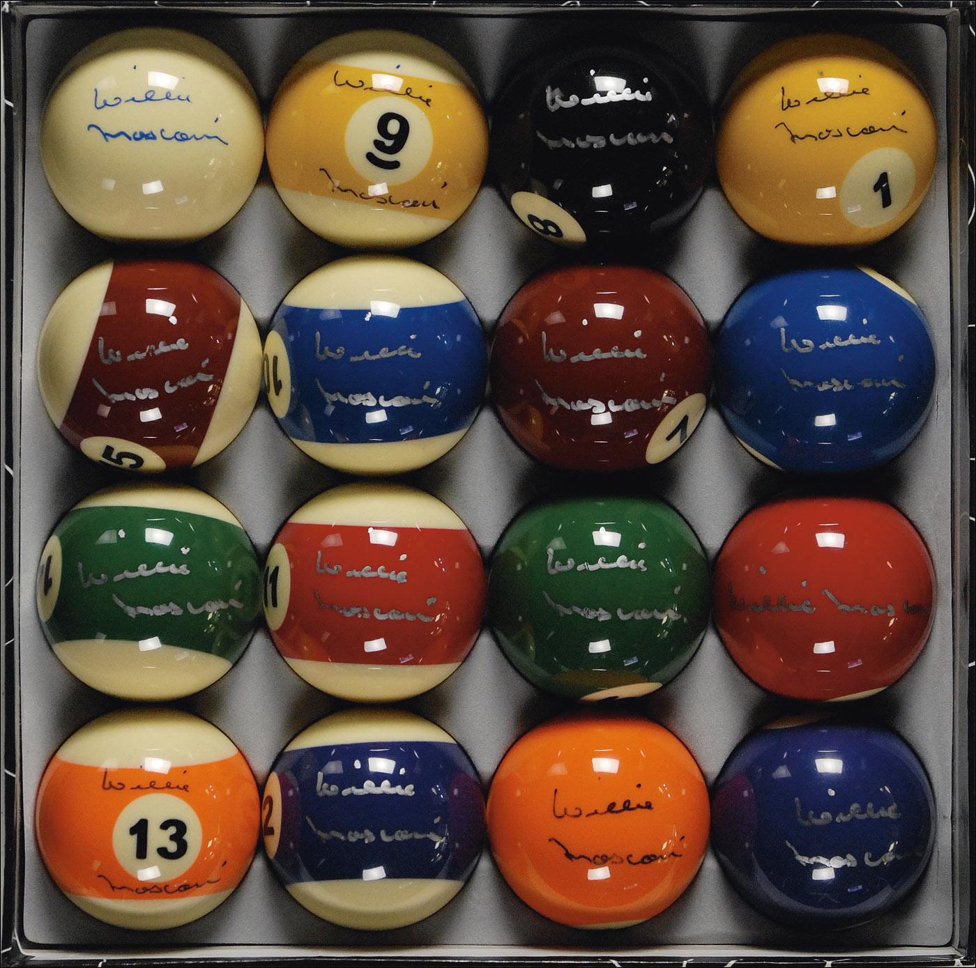 Complete set of 16 billiard balls, each signed in blue felt tip or silver ink by Mosconi. Several signature brushes, dings to balls, and some flaking to the silver ink signatures, otherwise fine condition.