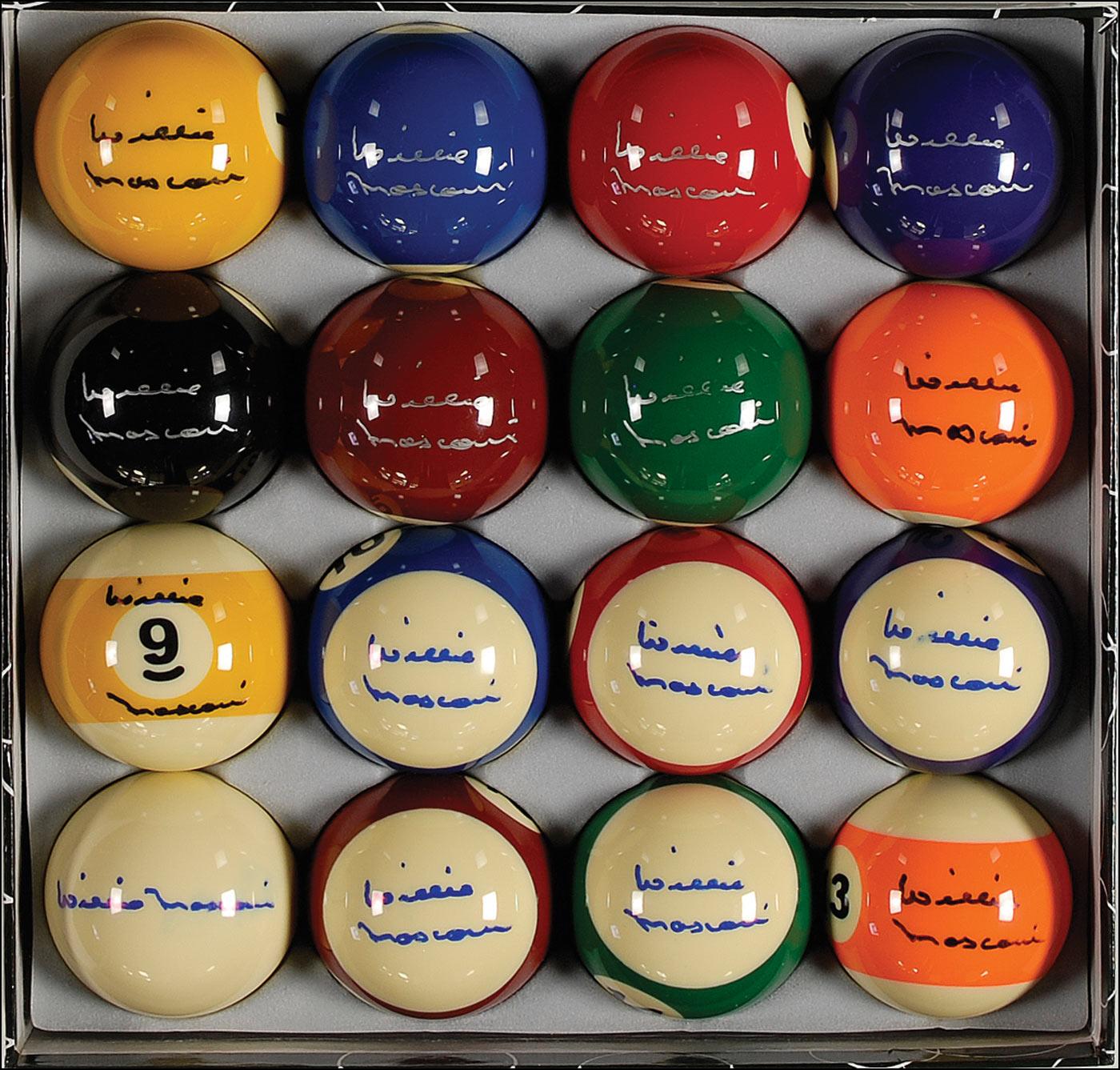 Complete set of 16 billiard balls, each signed in blue felt tip or silver ink by Mosconi. In fine condition, with a bit of flaking to the silver ink signatures.