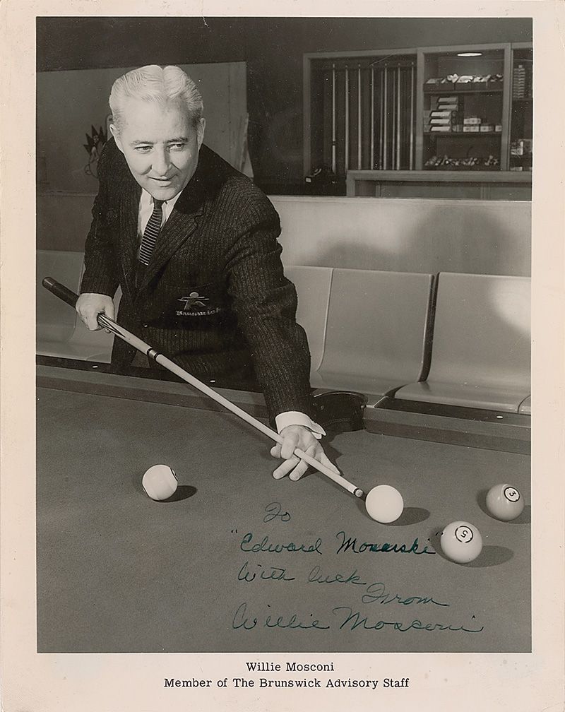 Vintage glossy 8 x 10 Brunswick publicity photo of Mosconi shooting pool, signed and inscribed in fountain pen “To ‘Eddie Monaiski,’ with luck, from Willie Mosconi.” In very good condition, with scattered creases and spotting to the finish, a tear to the top border, and mounting remnants to reverse.