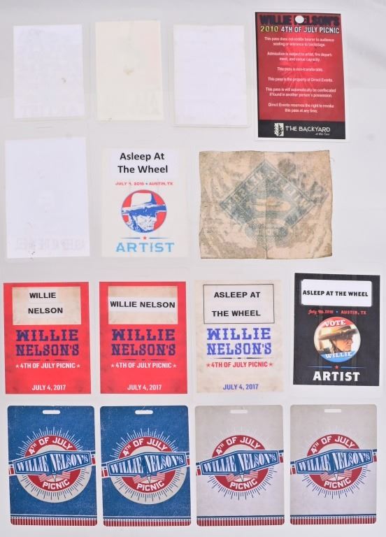 Fifteen Backstage artist's passes from Willie Nelson's Willie Nelson 4th of July Picnic. Most are labeled to Asleep At The Wheel, with four labeled Willie Nelson. Also includes souvenir key chain. From Ray Benson's personal collection. Framed.