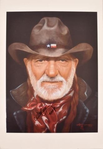 Willie Nelson autographed print 12" x 18", signed by Willie in 2004. Artist's mark "Timmons 2003" bottom right. From the Rick Perkal Estate Collection from Austin Texas.